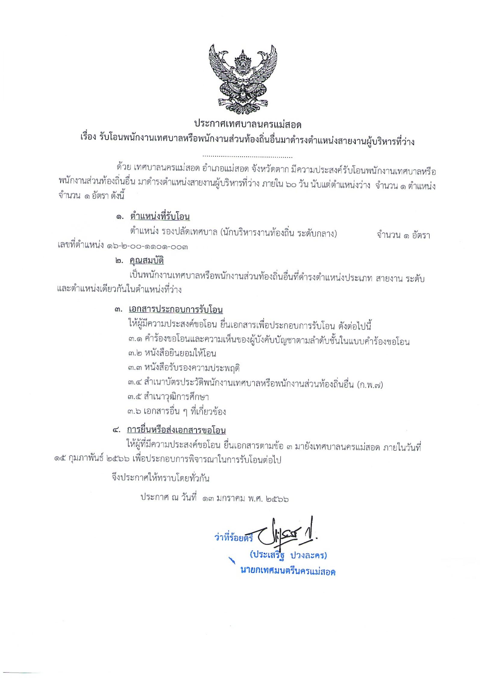 ประกาศเทศบาลนครแม่สอด เรื่อง รับโอนพนักงานเทศบาลหรือพนักงานส่วนท้องถิ่นอื่นมาดำรงตำแหน่งสายงานผู้บริหารที่ว่าง