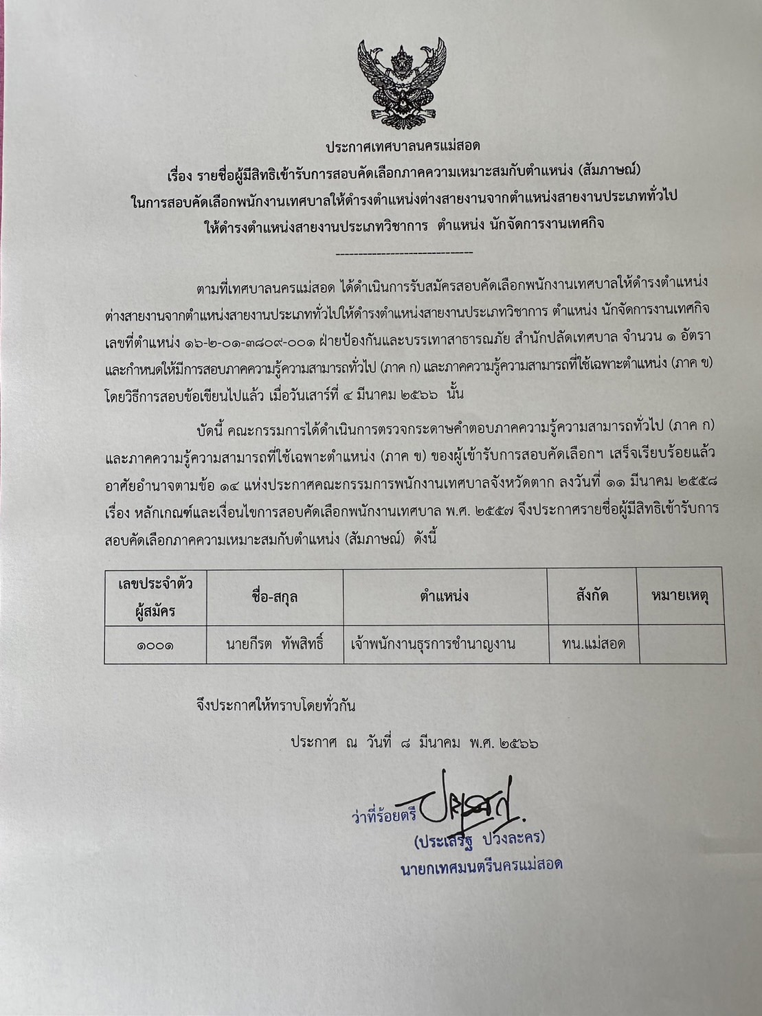 ประกาศเทศบาลนครแม่สอด ลงวันที่ 8 มีนาคม 2566 เรื่อง รายชื่อผู้มีสิทธิเข้ารับการสอบคัดเลือกภาคความเหมาะสมกับตำแหน่ง (สัมภาษณ์)