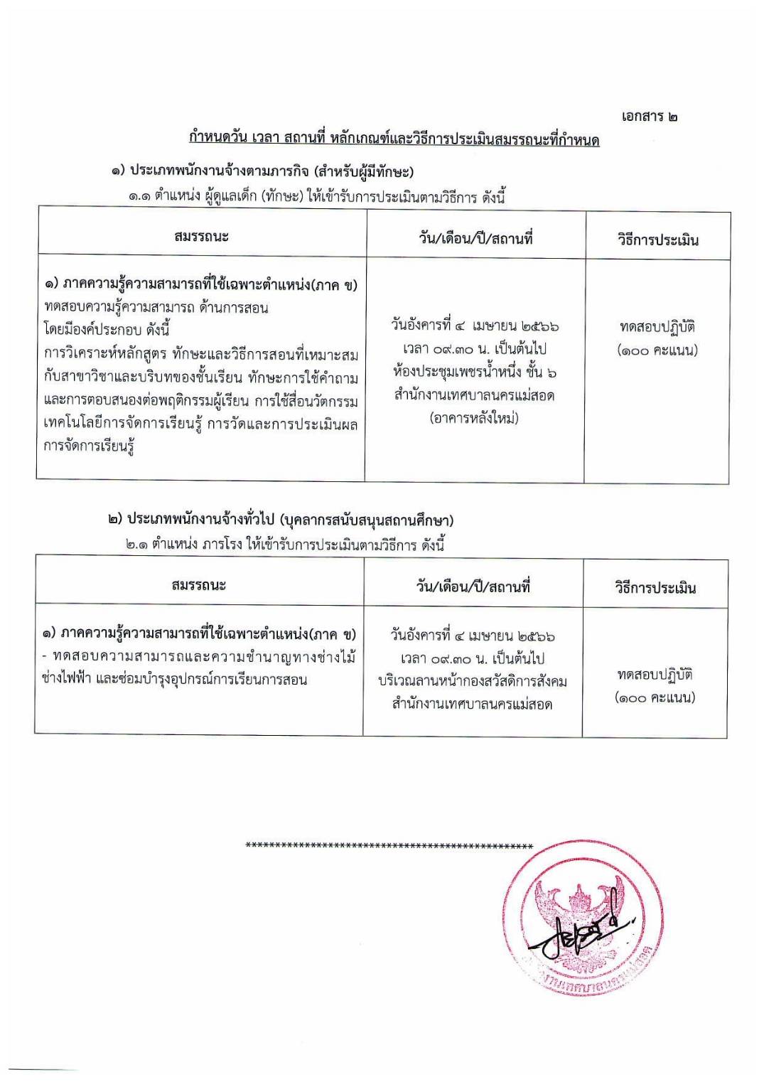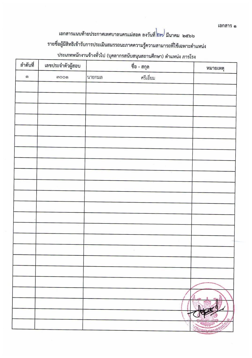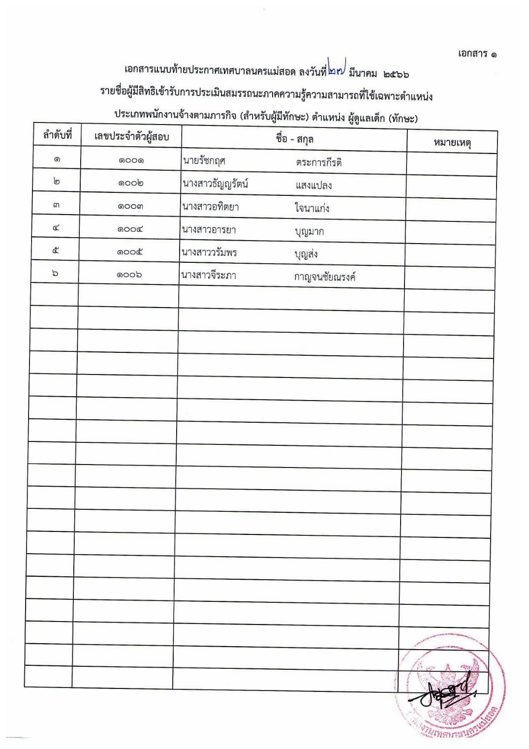 ประกาศเทศบาลนครแม่สอด เรื่อง รายชื่อผู้ที่มีสิทธิเข้ารับการประเมินภาคความรู้ความสามารถที่ใช้เฉพาะตำแหน่ง (ภาค ข) และกำหนดวัน เวลา สถานที่ในการประเมิน