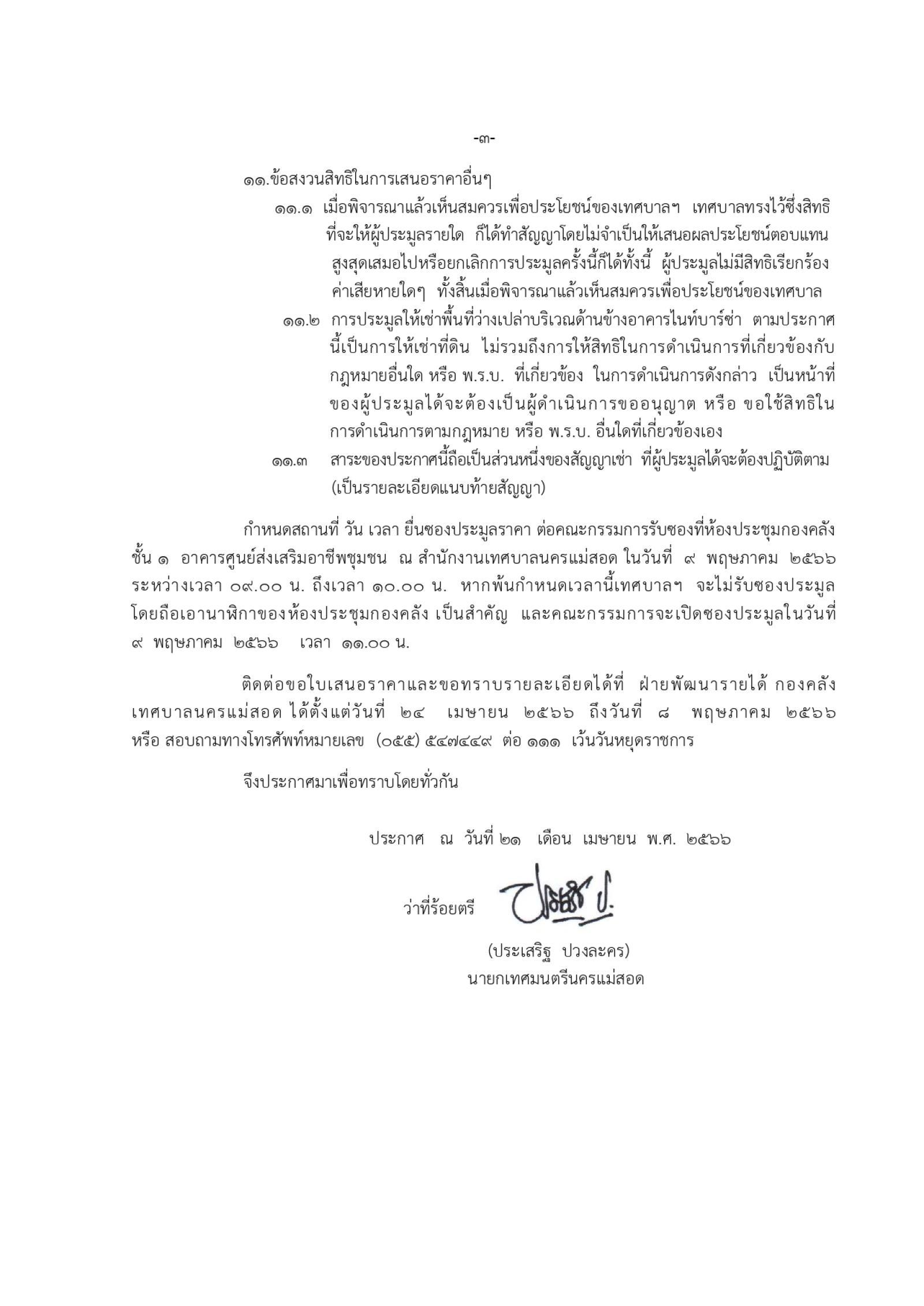 ประกาศเทศบาลนครแม่สอด เรื่อง เปิดประมูลให้เช่าพื้นที่ว่างเปล่าบริเวณด้านข้างอาคารไนท์บาร์ซ่า