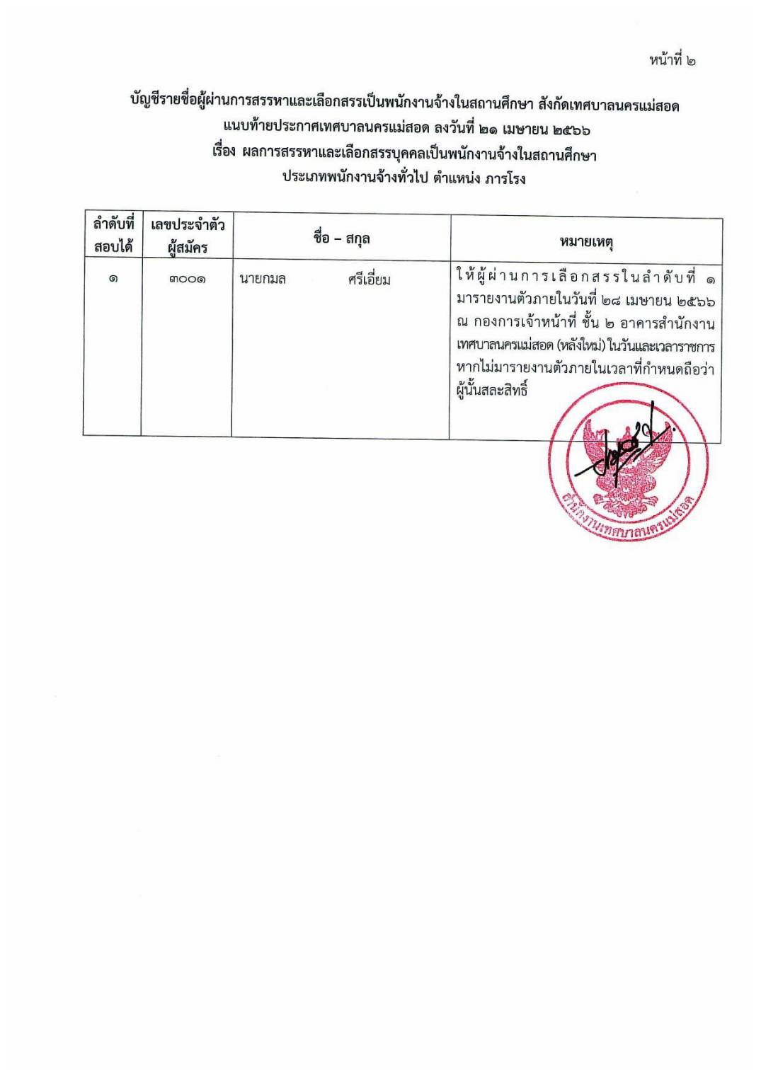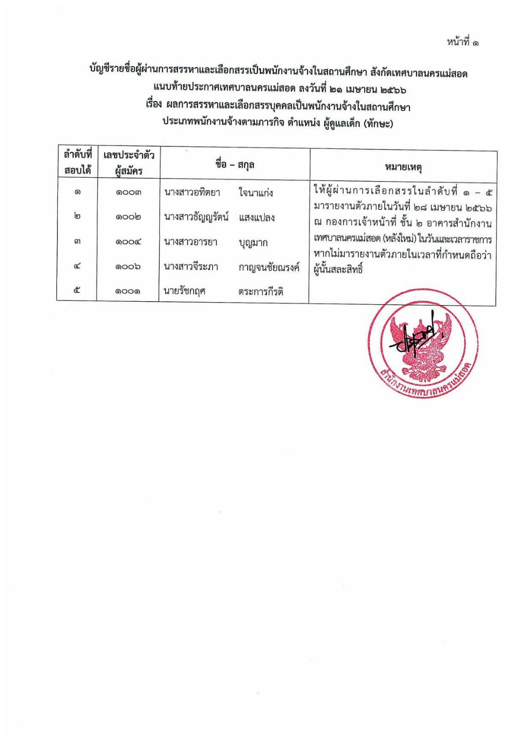 ประกาศเทศบาลนครแม่สอด เรื่อง ผลการสรรหาและเลือกบุคคลเป็นพนักงานจ้างในสถานศึกษา