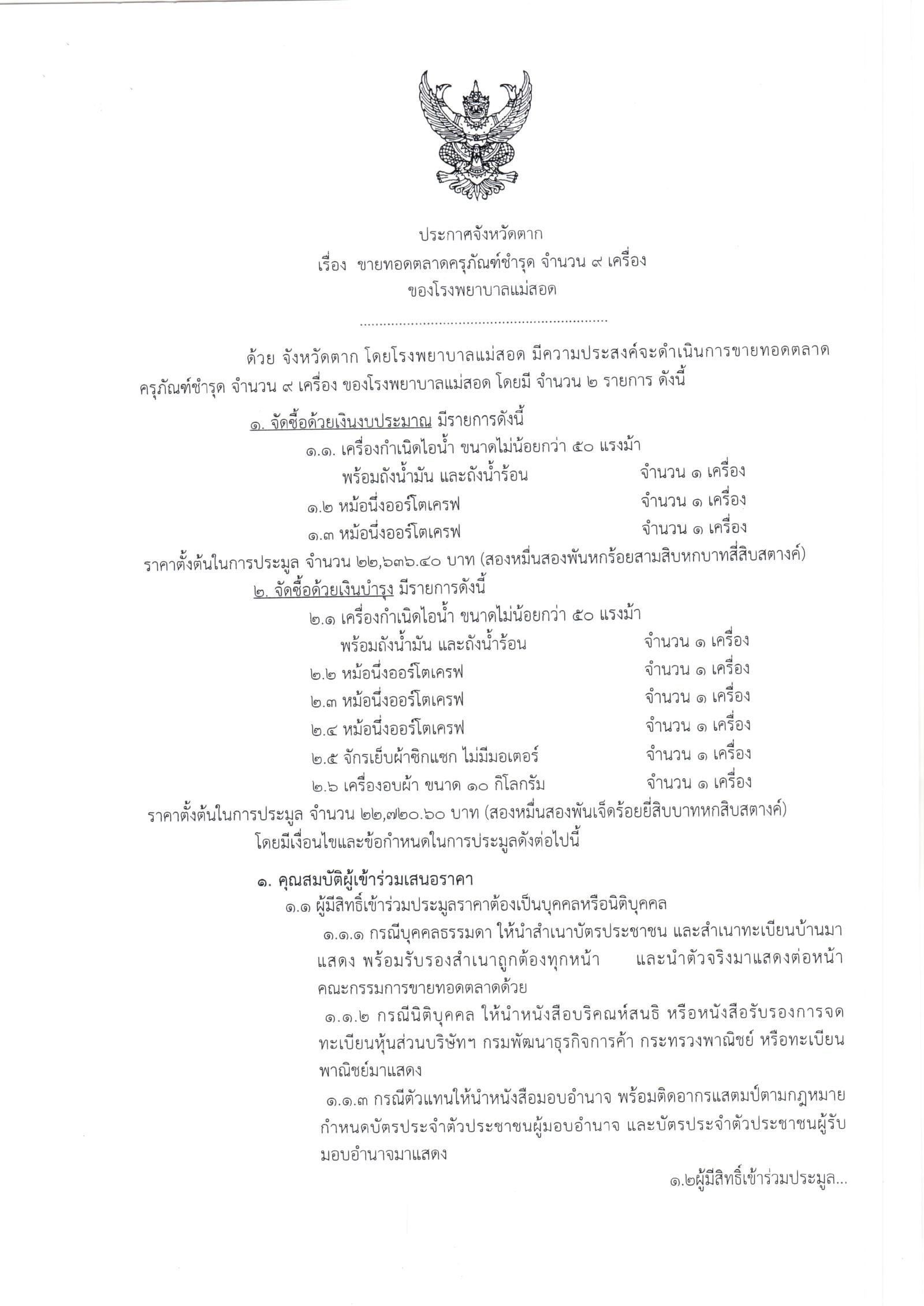 ประกาศจังหวัดตาก เรื่อง ขายทอดตลาดครุภัณฑ์ชำรุด จำนวน 9 เครื่อง ของโรงพยาบาลแม่สอด