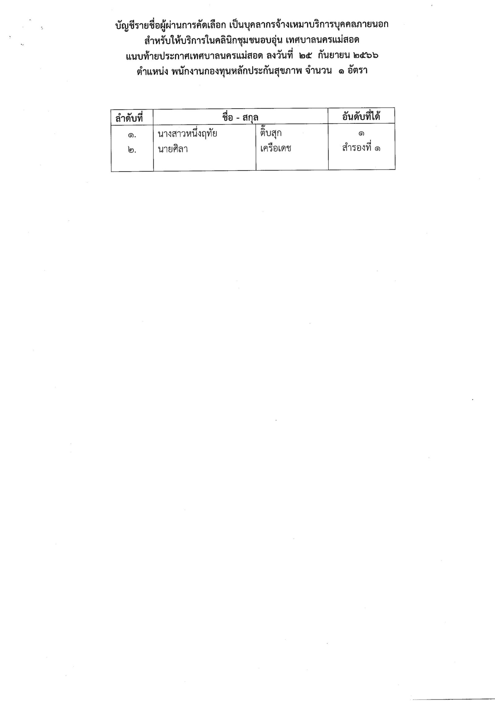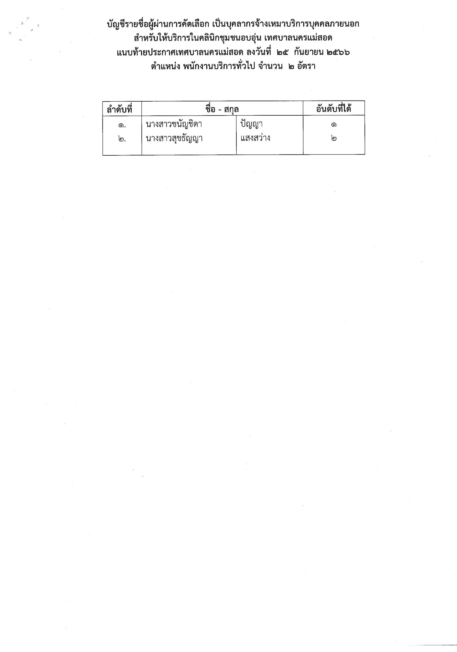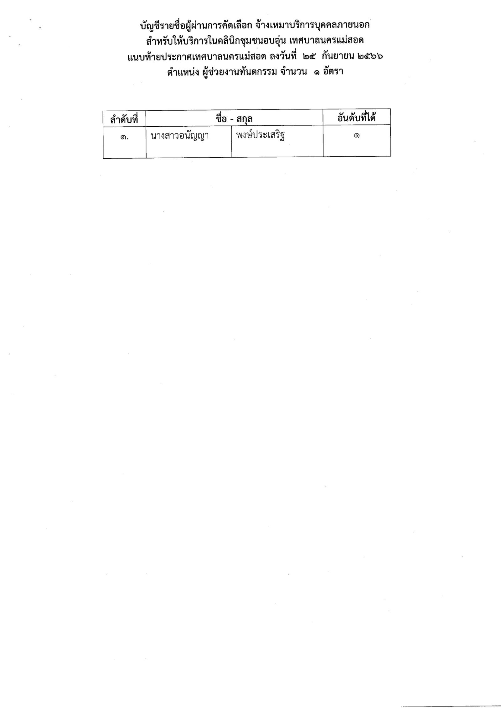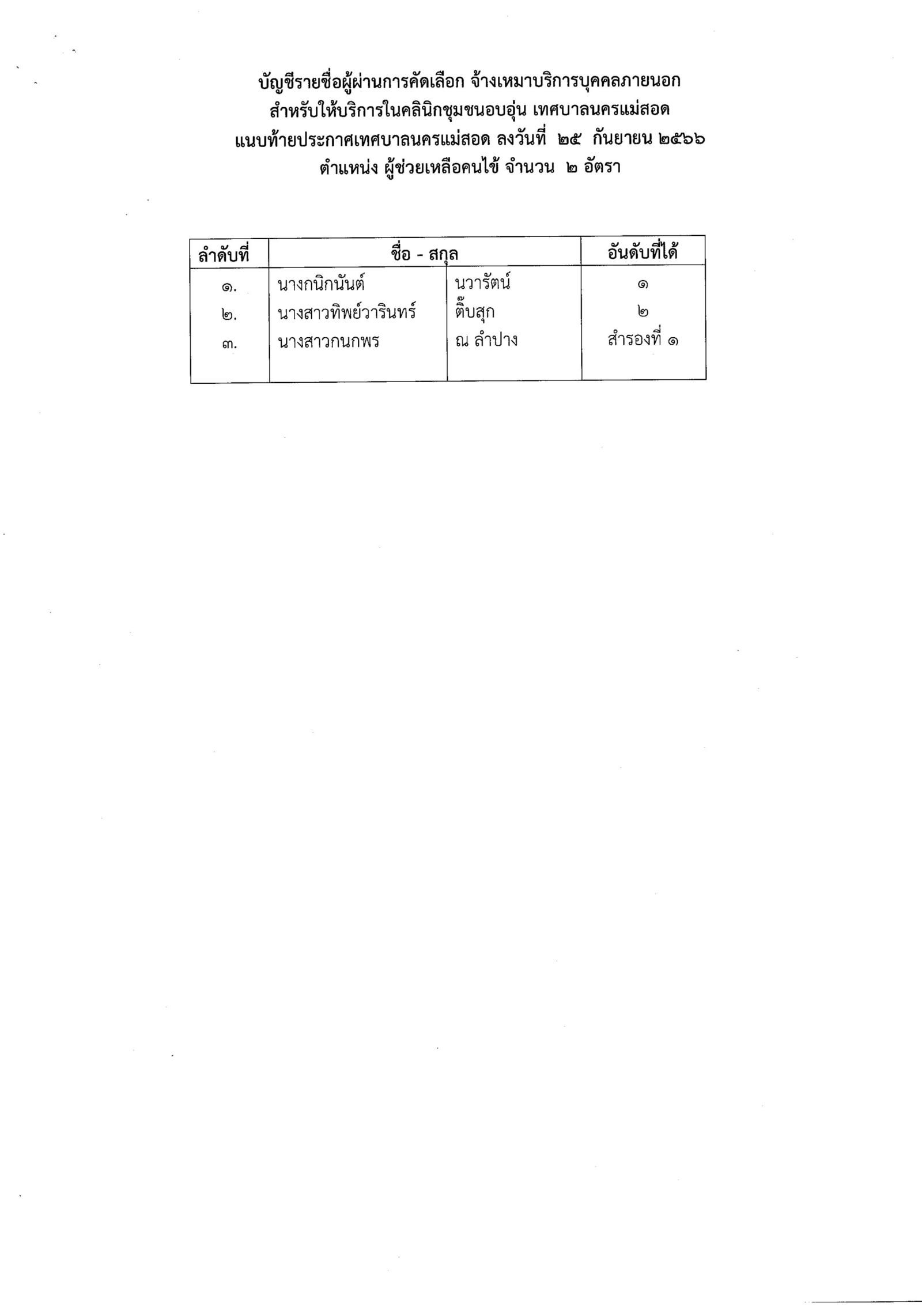 ประกาศเทศบาลนครแม่สอด เรื่อง ประกาศผลการคัดเลือกผู้ผ่านการคัดเลือก การจ้างเหมาบริการบุคคลภายนอก สำหรับให้บริการในคลินิกชุมชนอบอุ่น เทศบาลนครแม่สอด ประจำปีงบประมาณ 2567 จำนวน 18 ตำแหน่ง (รวม 28 อัตรา)