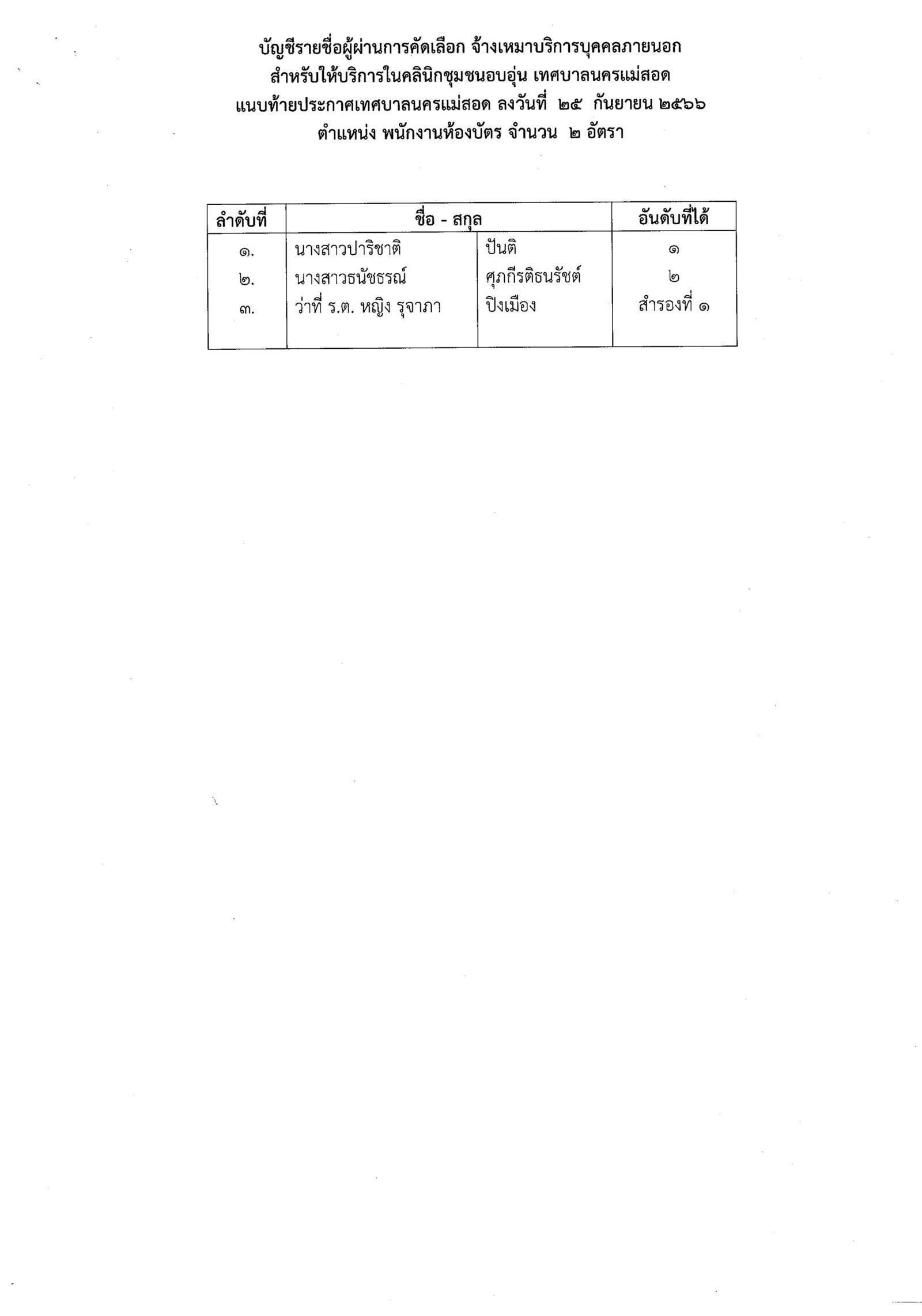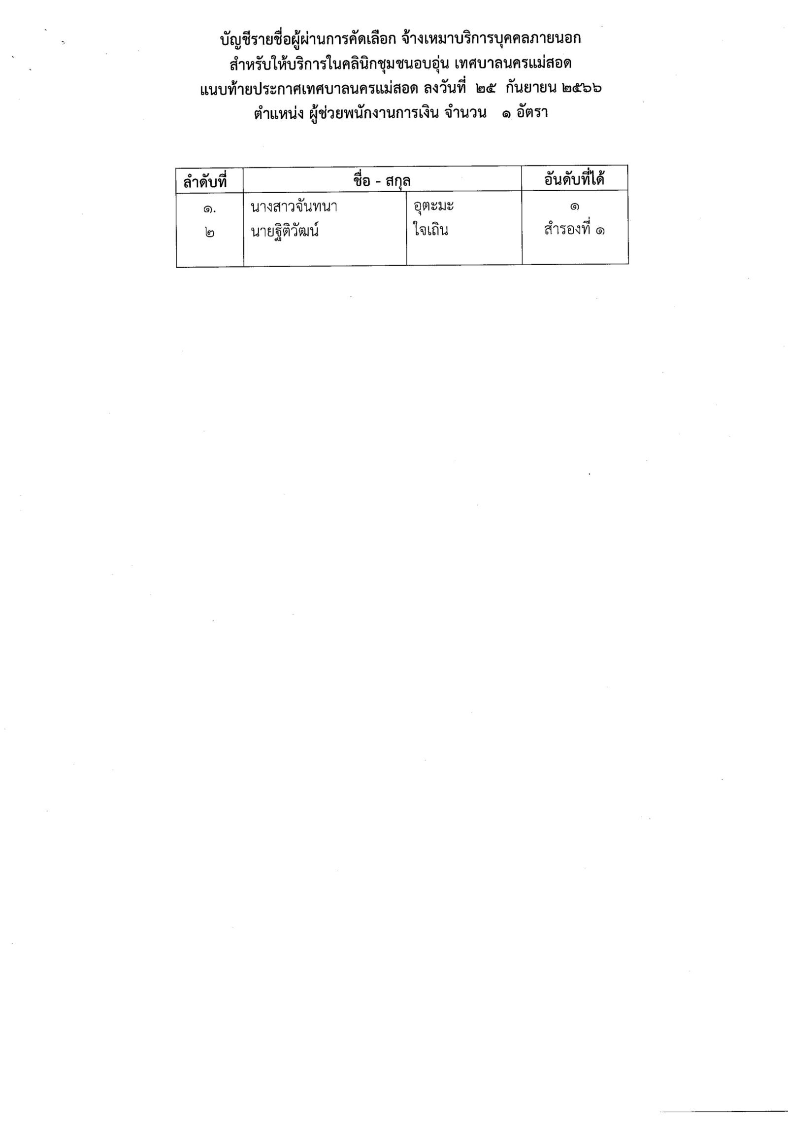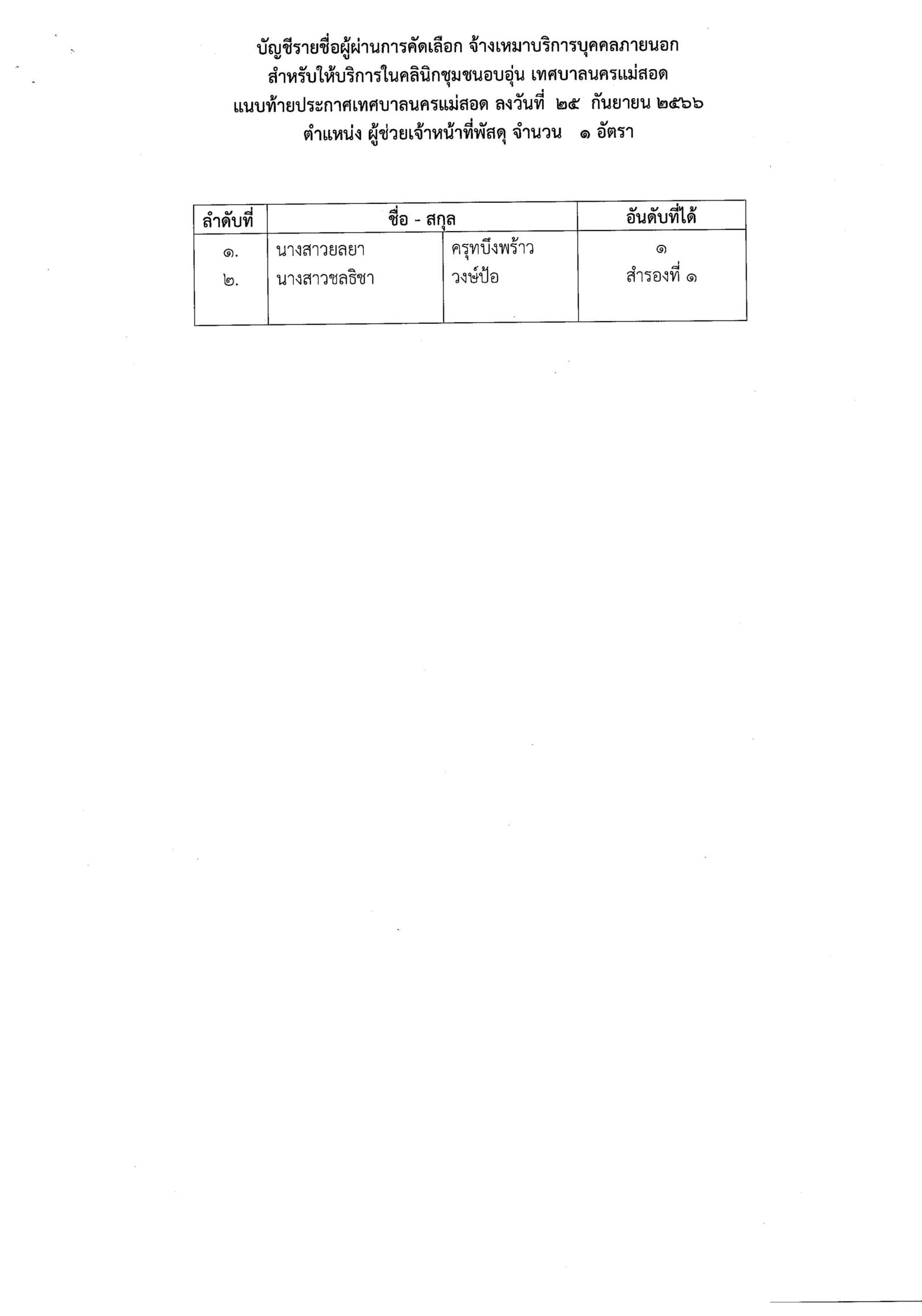ประกาศเทศบาลนครแม่สอด เรื่อง ประกาศผลการคัดเลือกผู้ผ่านการคัดเลือก การจ้างเหมาบริการบุคคลภายนอก สำหรับให้บริการในคลินิกชุมชนอบอุ่น เทศบาลนครแม่สอด ประจำปีงบประมาณ 2567 จำนวน 18 ตำแหน่ง (รวม 28 อัตรา)