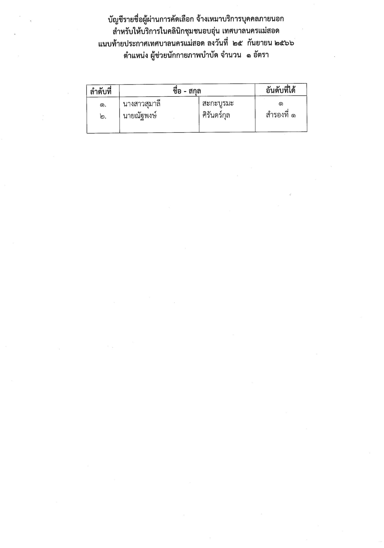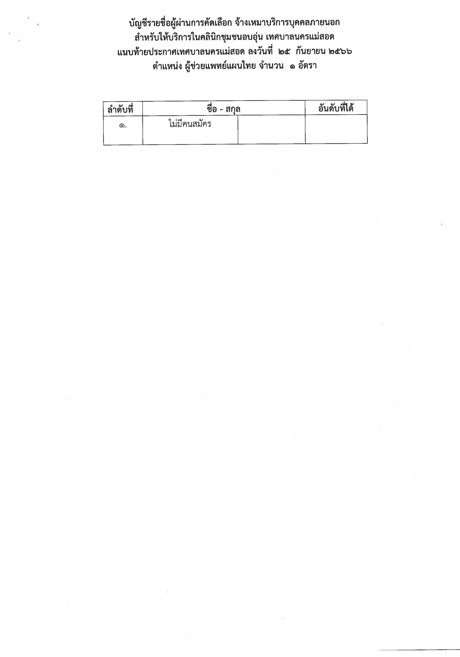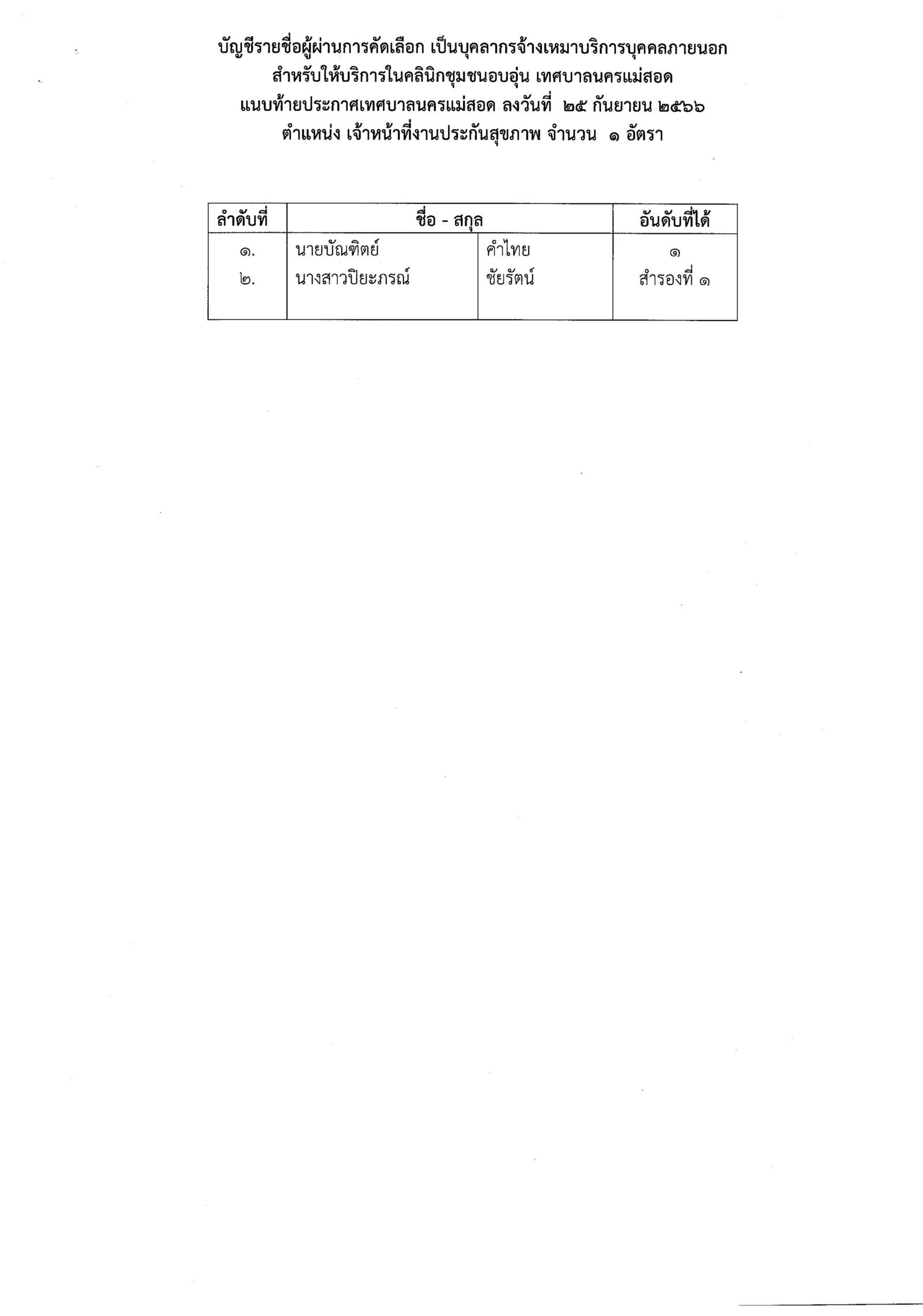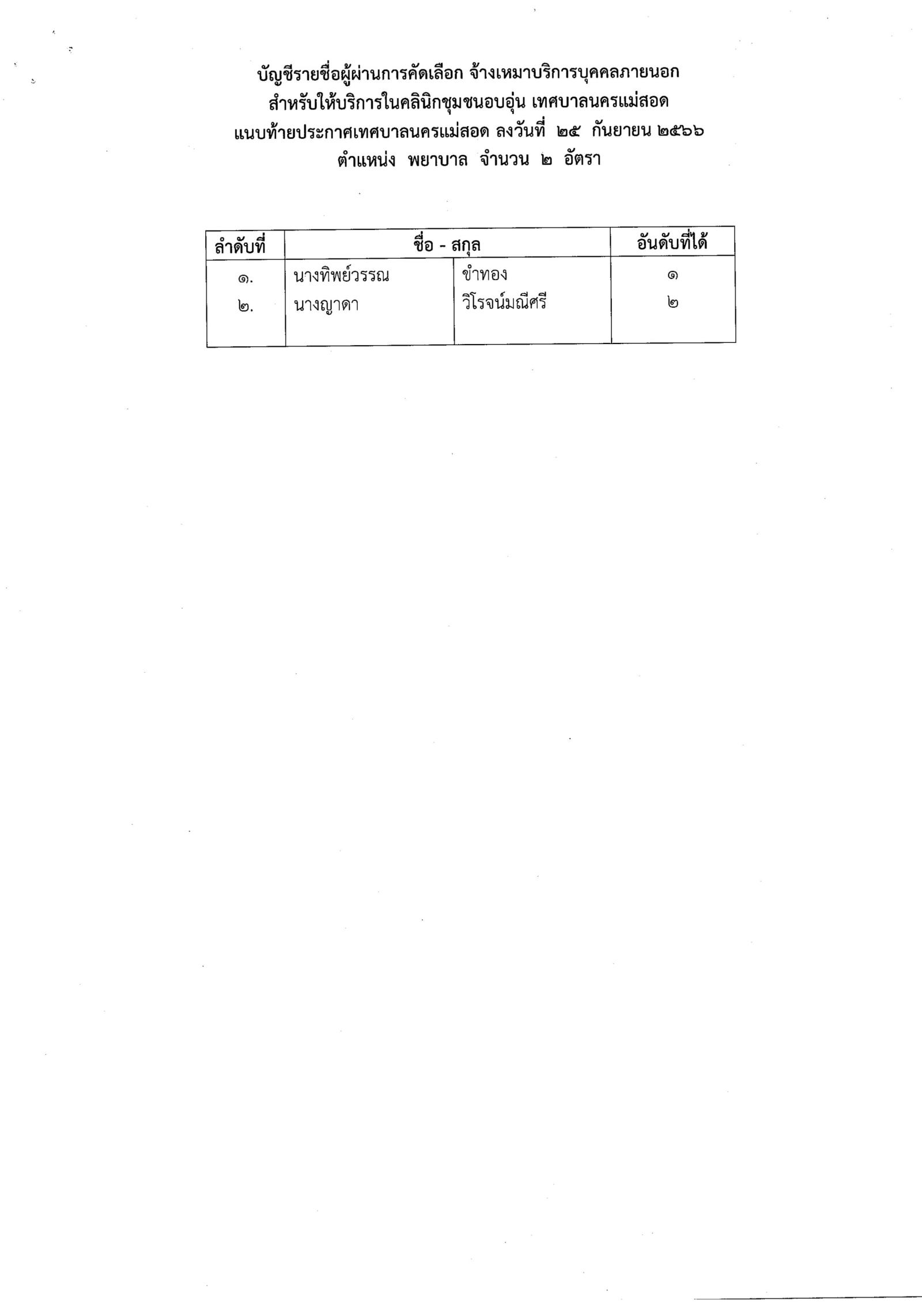 ประกาศเทศบาลนครแม่สอด เรื่อง ประกาศผลการคัดเลือกผู้ผ่านการคัดเลือก การจ้างเหมาบริการบุคคลภายนอก สำหรับให้บริการในคลินิกชุมชนอบอุ่น เทศบาลนครแม่สอด ประจำปีงบประมาณ 2567 จำนวน 18 ตำแหน่ง (รวม 28 อัตรา)