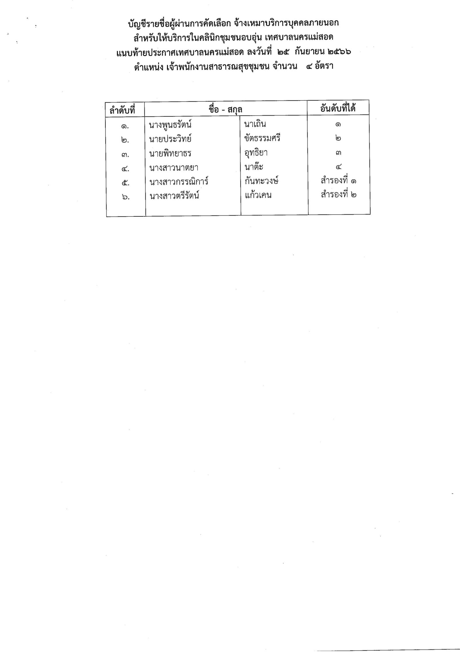 ประกาศเทศบาลนครแม่สอด เรื่อง รายชื่อผู้มีสิทธิสอบคัดเลือกบุคคลภายนอกสำหรับให้บริการในคลินิกชุมชนอบอุ่น เทศบาลนครแม่สอด จำนวน 4 ตำแหน่ง