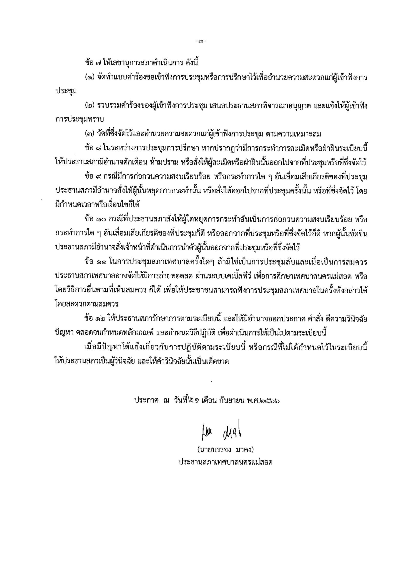 ประกาศสภาเทศบาลนครแม่สอด เรื่อง ใช้ระเบียบสภาเทศบาลนครแม่สอด ว่าด้วยการให้ประชาชนเข้าฟังการประชุมและการปรึกษาหารือของสภาเทศบาลนครแม่สอด พ.ศ.2566