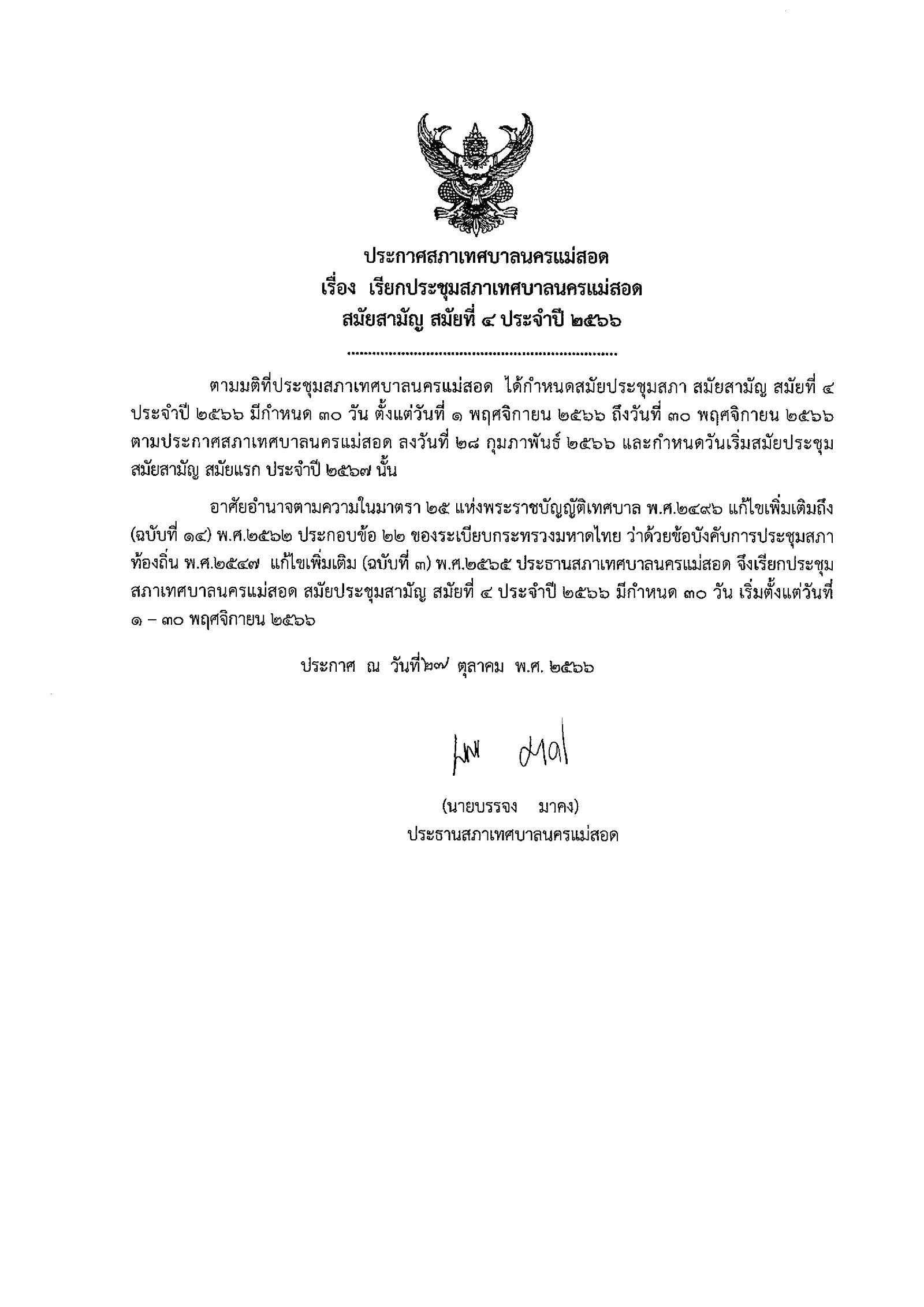 ประกาศสภาเทศบาลนครแม่สอด เรื่อง เรียกประชุมสภาเทศบาลนครแม่สอด สมัยสามัญ สมัยที่ 4 ประจำปี 2566