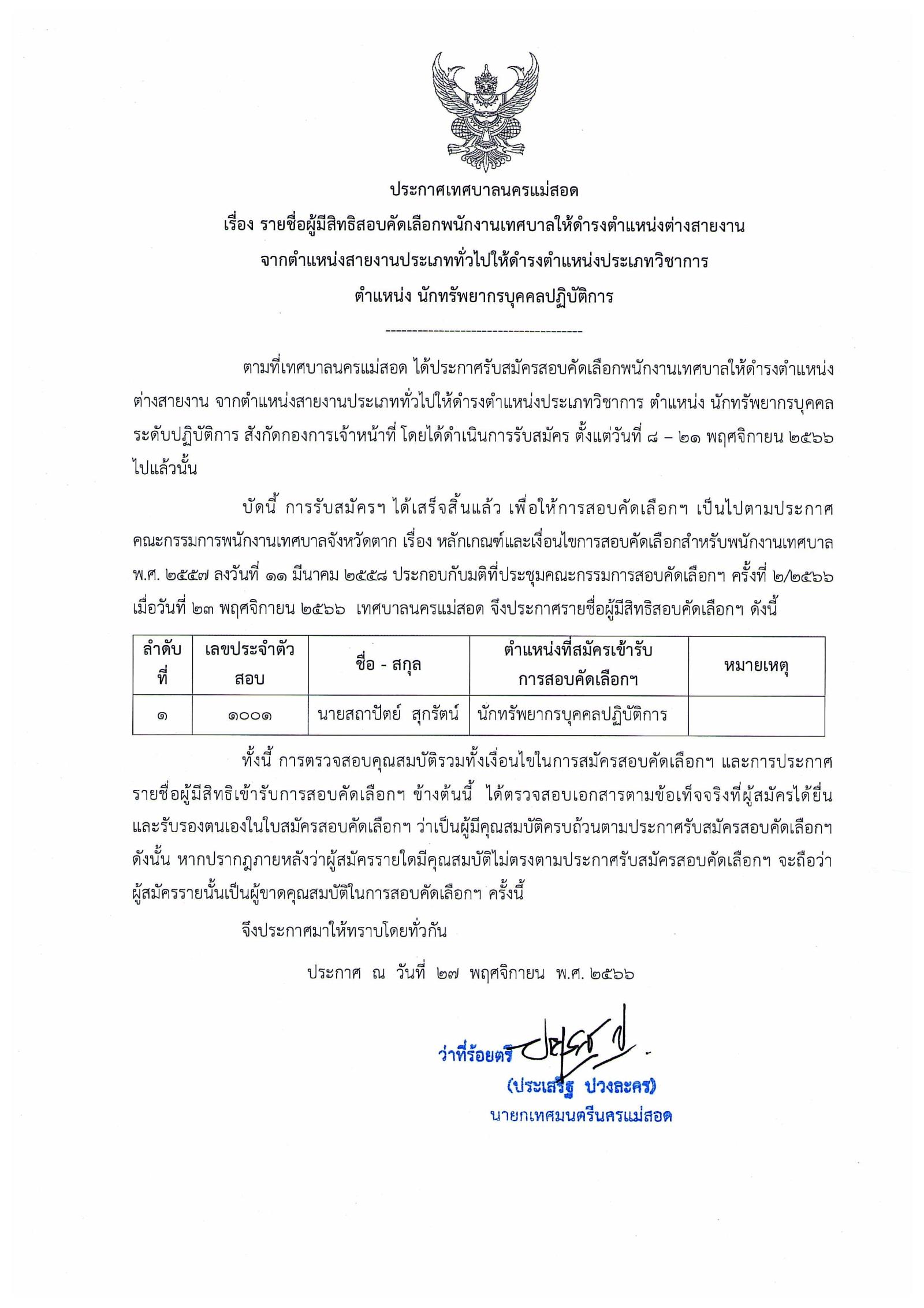 ประกาศเทศบาลนครแม่สอด เรื่อง รายชื่อผู้มีสิทธิสอบคัดเลือกพนักงานเทศบาลให้ดำรงตำแหน่งต่างสายงาน จากตำแหน่งสายงานประเถททั่วไปให้ดำรงตำแหน่งประเภทวิชาการ ตำแหน่ง นักทรัพยากรบุคคลปฏิบัติการ