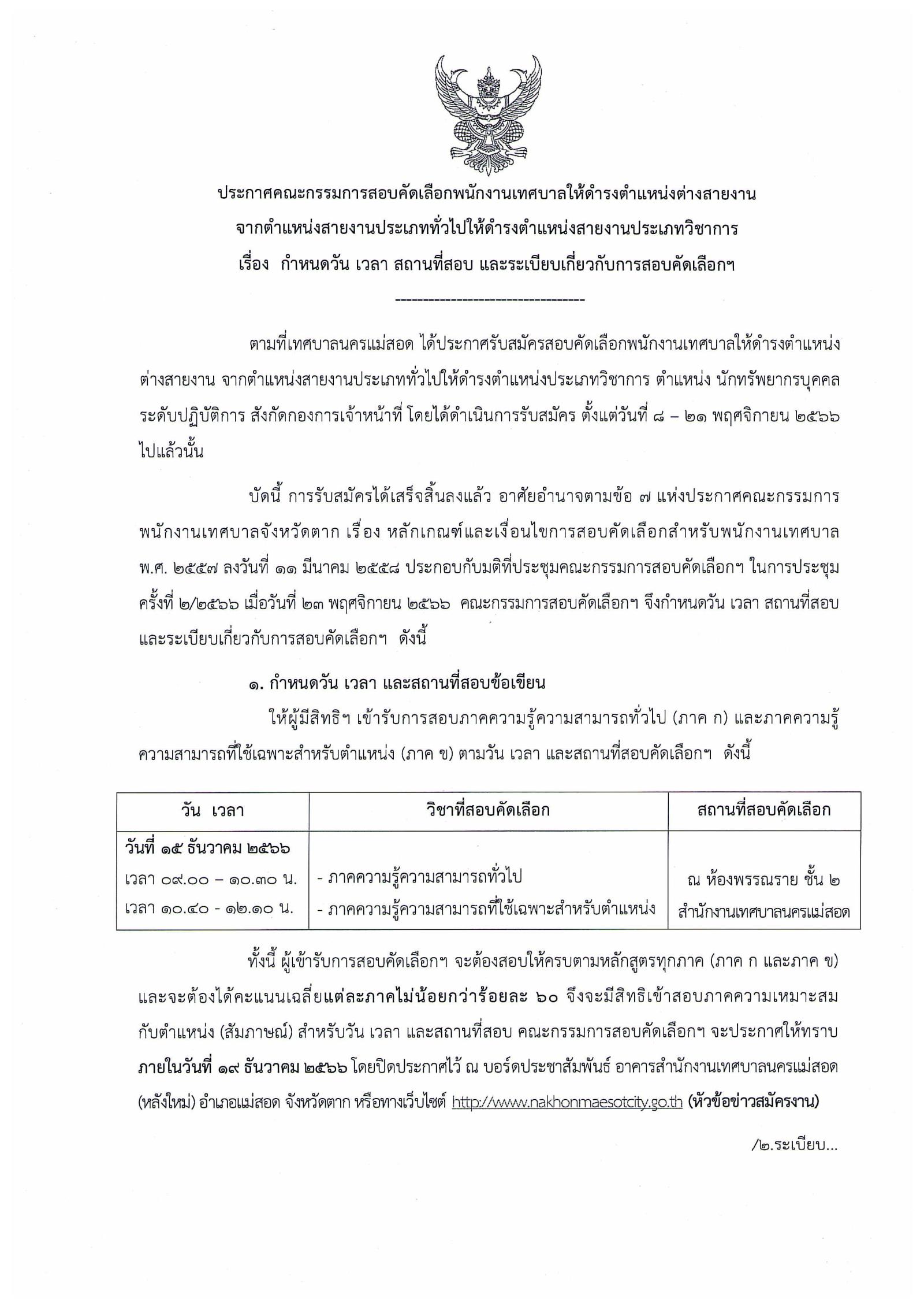 ประกาศเทศบาลนครแม่สอด เรื่อง รับสมัครสอบคัดเลือกพนักงานเทศบาลสายงานประเภททั่วไป เพื่อแต่งตั้งให้ดำรงตำแหน่งสายงานประเภทวิชาการ ระดับปฏิบัติการ