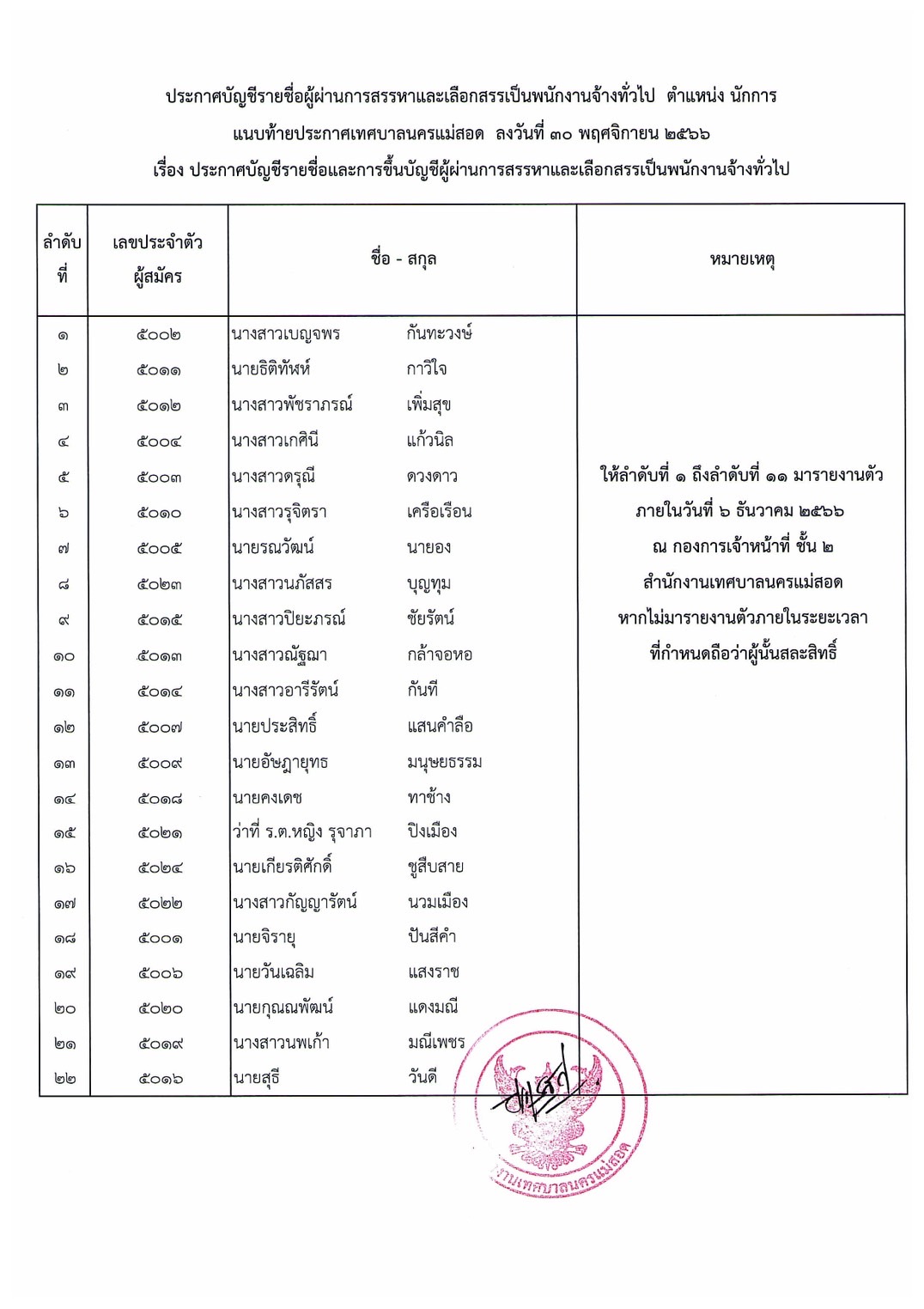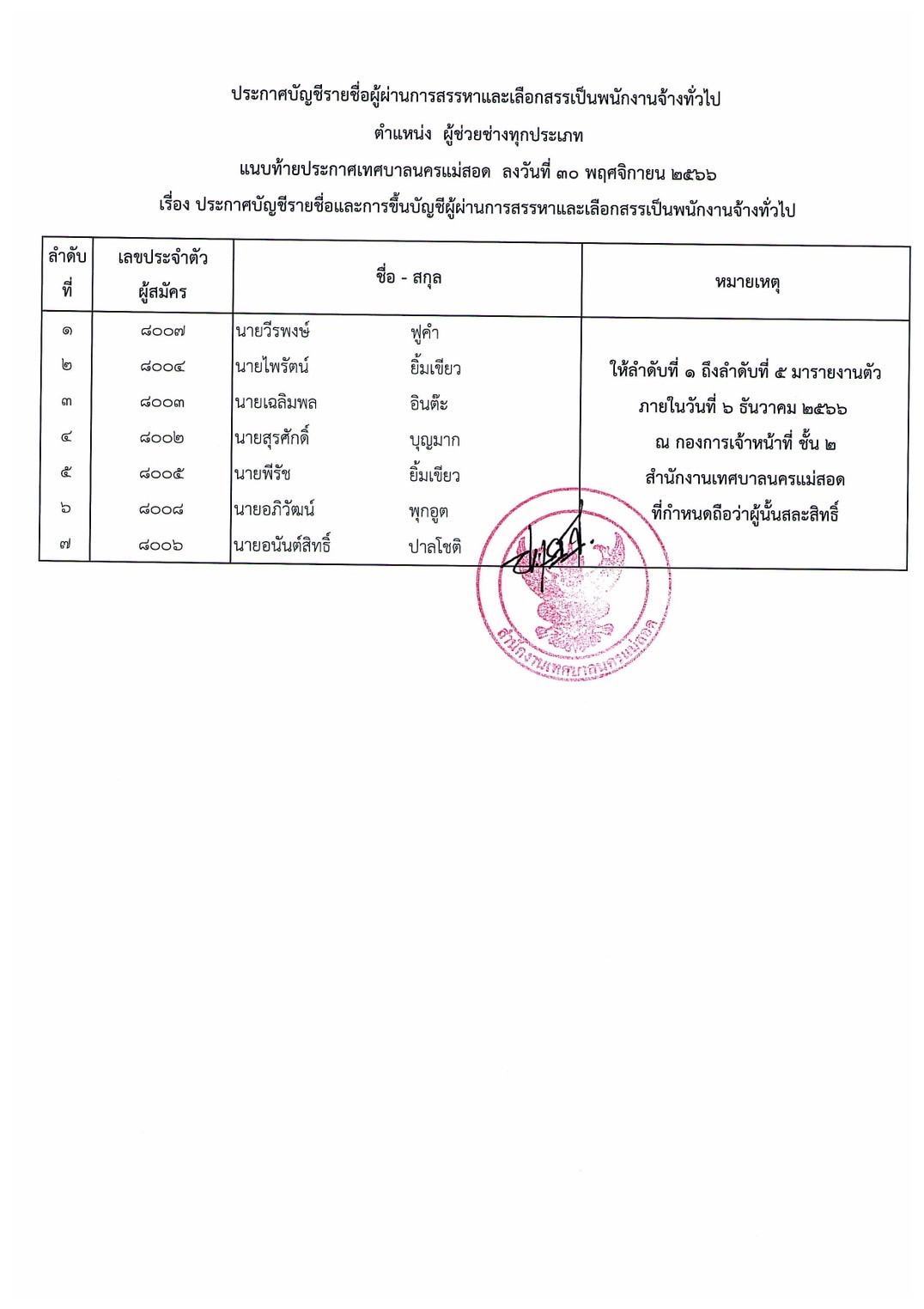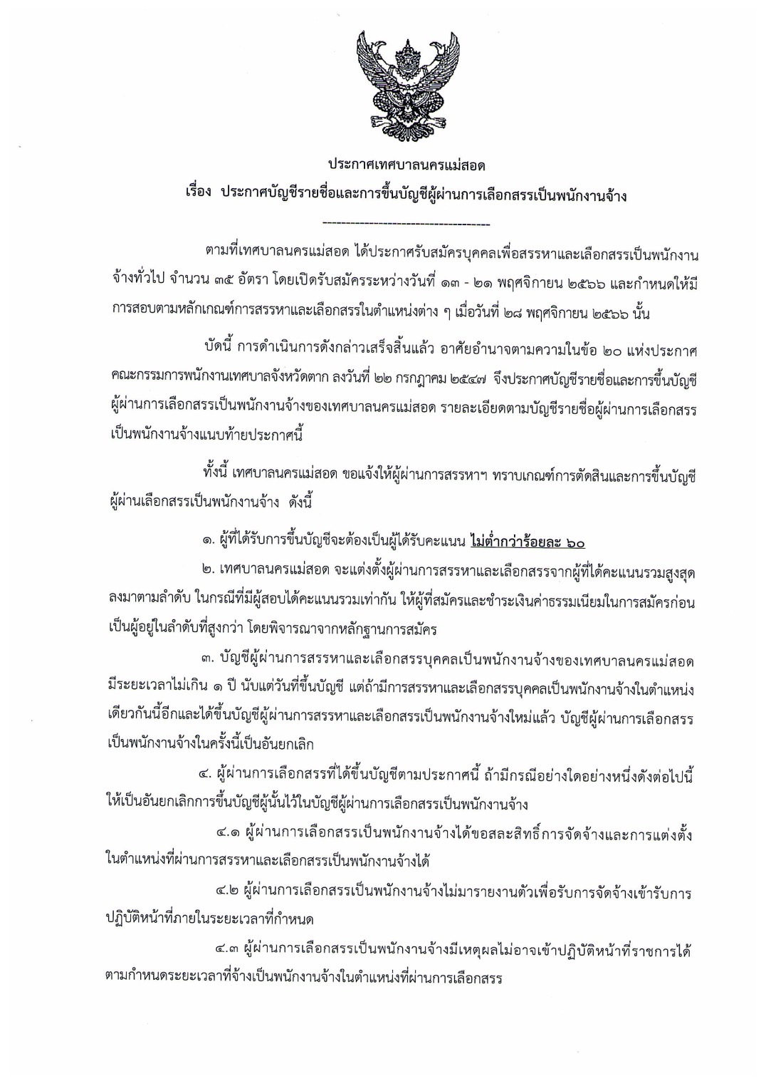 ประกาศเทศบาลนครแม่สอด เรื่อง ประกาศบัญชีรายชื่อและการขึ้นบัญชีผู้ผ่านการเลือกสรรเป็นพนักงานจ้าง