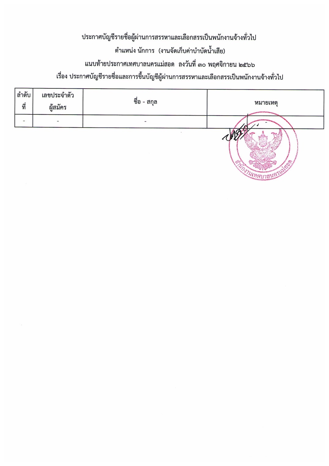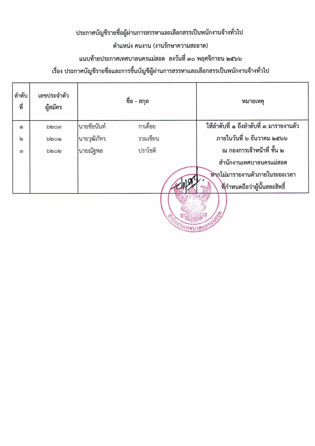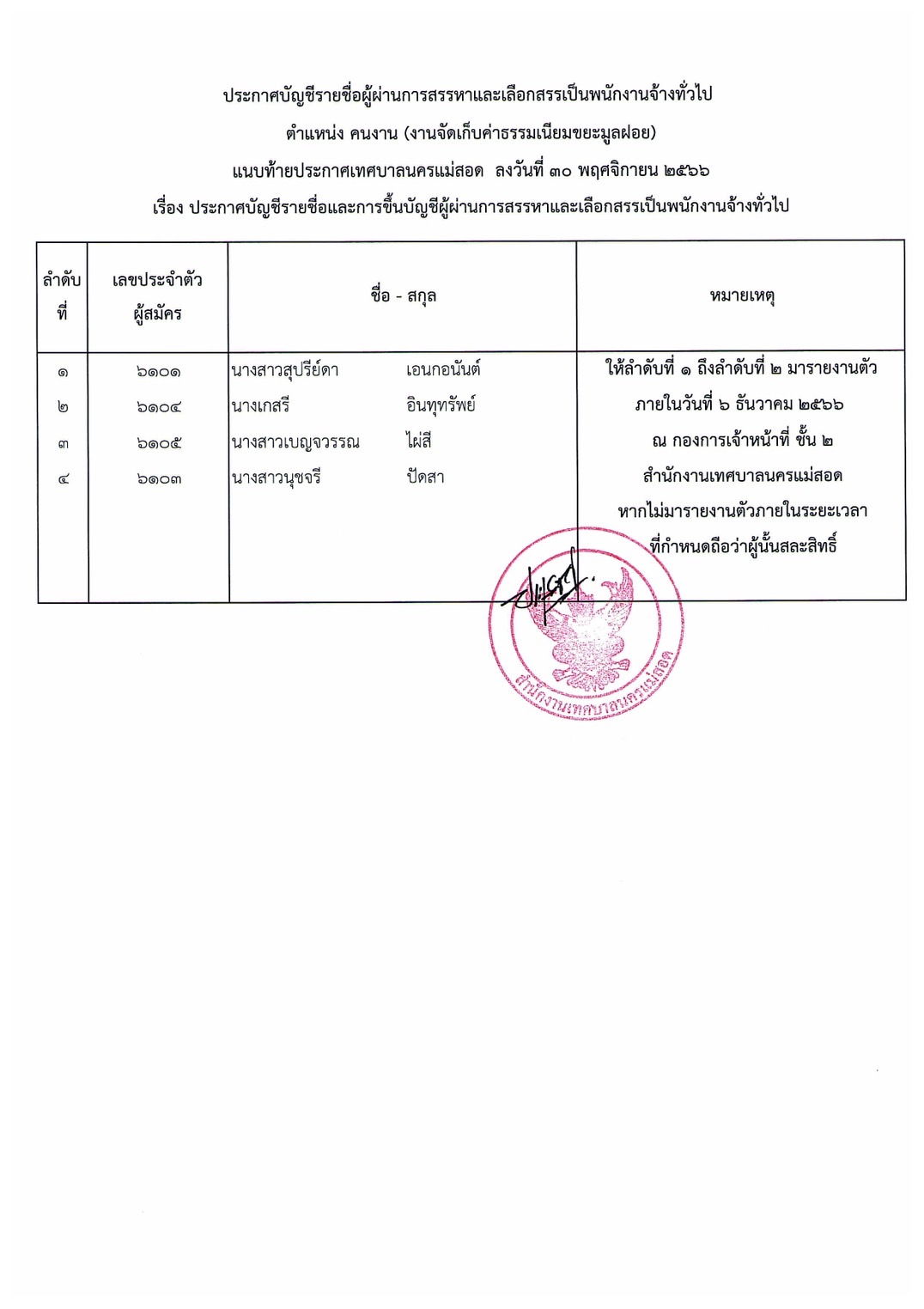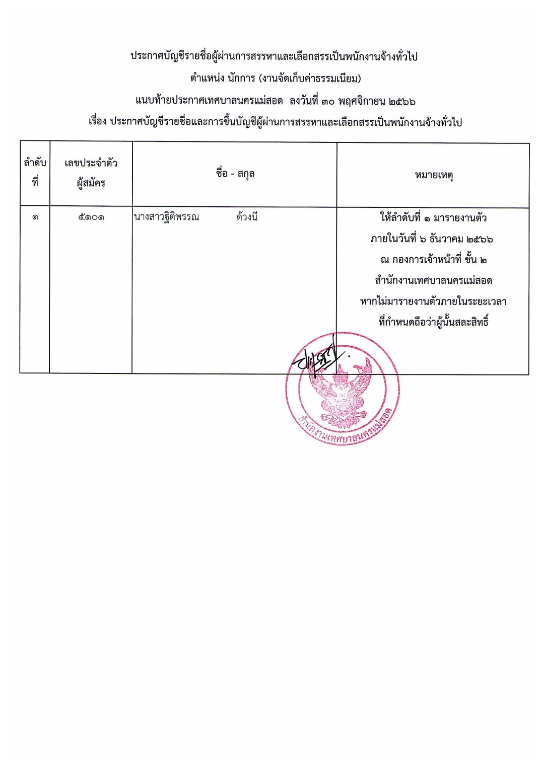 ประกาศเทศบาลนครแม่สอด เรื่อง ประกาศบัญชีรายชื่อและการขึ้นบัญชีผู้ผ่านการเลือกสรรเป็นพนักงานจ้าง
