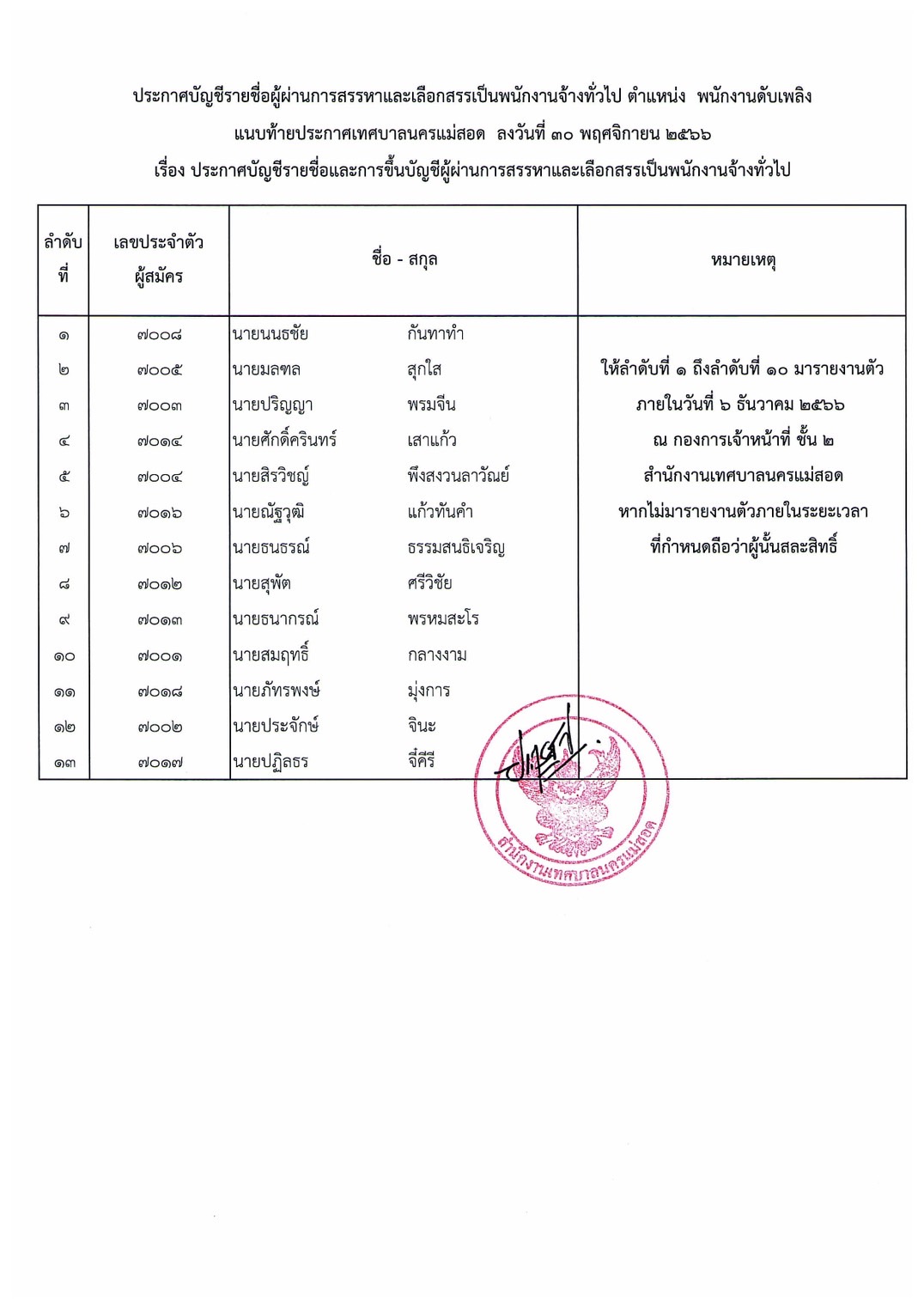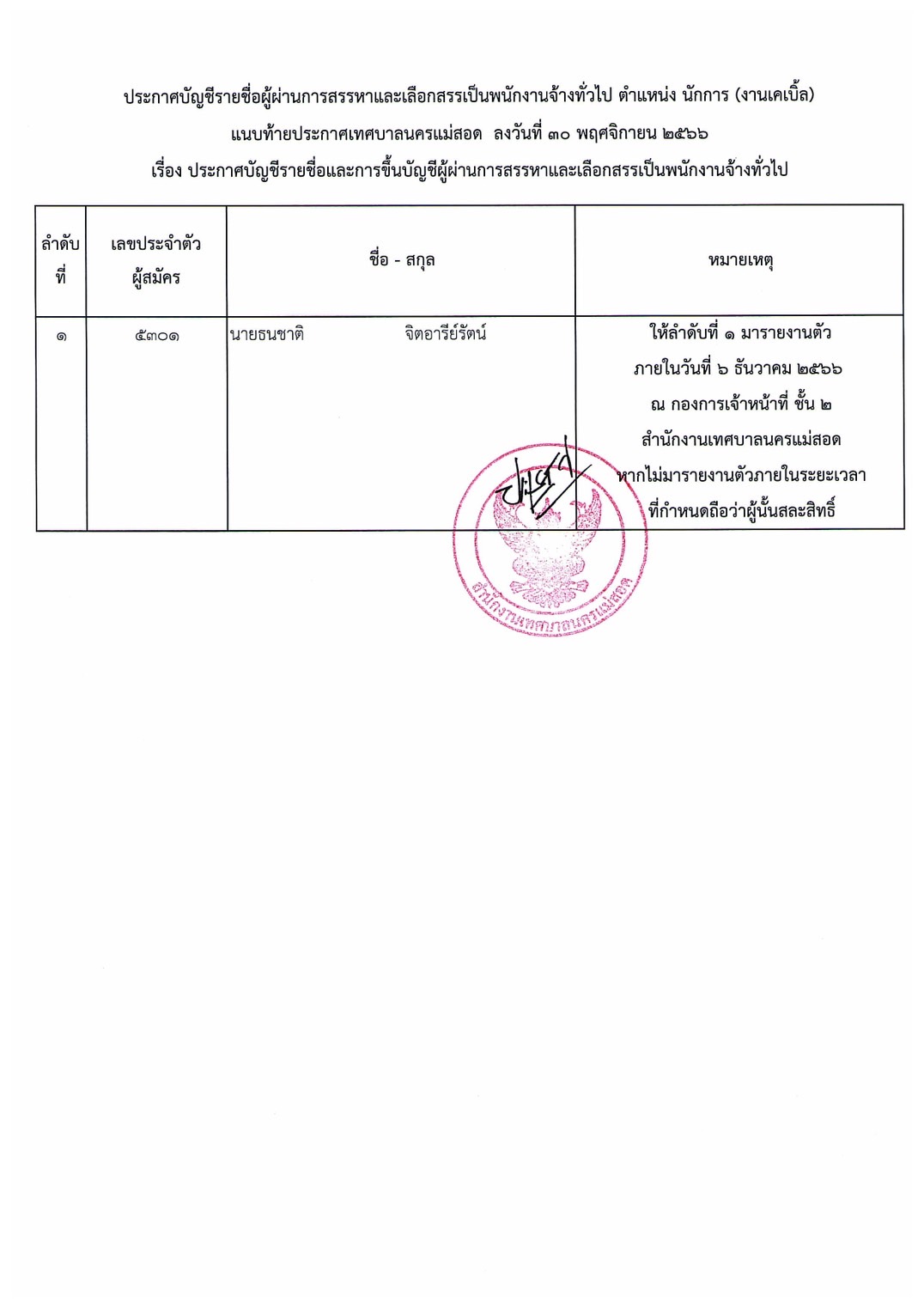 ประกาศเทศบาลนครแม่สอด เรื่อง รายชื่อผู้ผ่านการสอบคัดเลือกเพื่อแต่งตั้งให้ดำรงตำแหน่งต่างสายงาน จากตำแหน่งสายงานประเภททั่วไป ให้ดำรงตำแหน่งสายงานประเภทวิชาการ ตำแหน่ง นักจัดการงานทั่วไป ระดับปฏิบัติการ