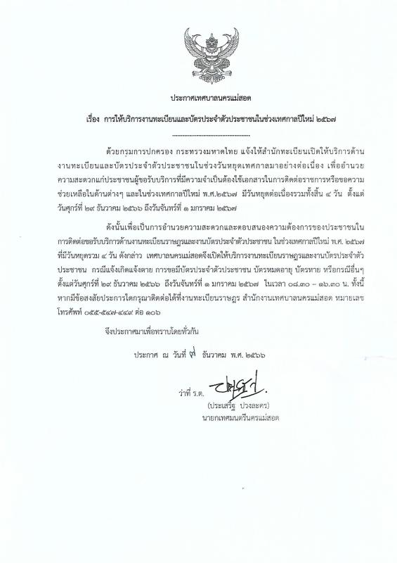 ประกาศเทศบาลนครแม่สอด เรื่อง การให้บริการงานทะเบียนและบัตรประจำตัวประชาชนในช่วงเทศกาลปีใหม่ 2567