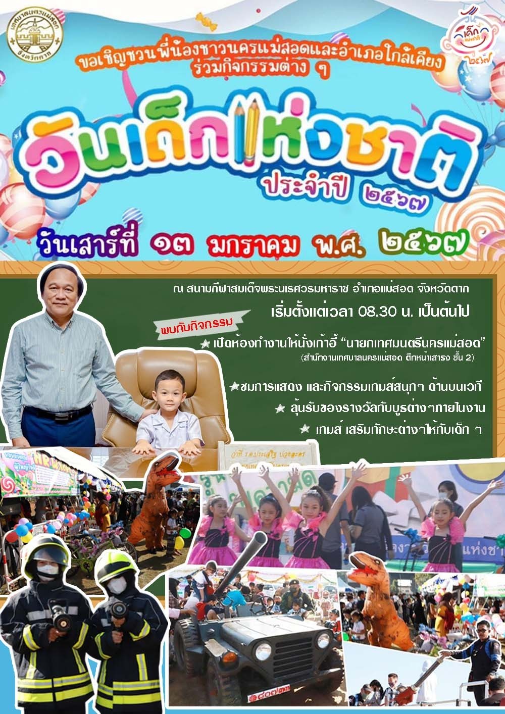 เทศบาลนครแม่สอด ขอเชิญร่วมกิจกรรมวันเด็กแห่งชาติ ประจำปี 2567 วันเสาร์ ที่ 13 มกราคม 2567 เวลา 08.30 น. เป็นต้นไป ณ สนามกีฬาสมเด็จพระนเรศวรมหาราช เทศบาลนครแม่สอด อำเภอแม่สอด จังหวัดตาก
