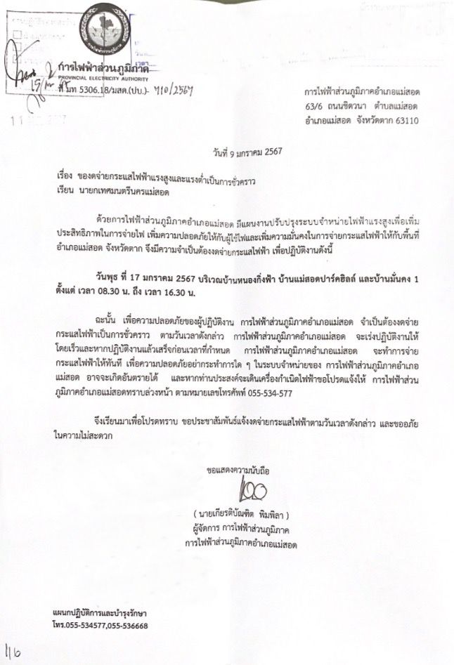 เทศบาลนครแม่สอดขอประชาสัมพันธ์ เนื่องจากการไฟฟ้าส่วนภูมิภาคอำเภอแม่สอดมีแผนงานปรับปรุงระบบจำหน่ายไฟฟ้าแรงสูงเพื่อเพิ่มประสิทธิภาพในการจ่ายไฟ เพิ่มความปลอดภัยให้กับผู้ใช้ไฟและเพิ่มความมั่นคงในการจ่ายกระแสไฟฟ้าให้กับพื้นที่อำเภอแม่สอด จังหวัดตาก จึงมีความจำเป็นต้องงดจ่ายกระแสไฟฟ้า เพื่อปฏิบัติงานดังนี้ วันพุธ ที่ 17 มกราคม 2567 บริเวณ บ้านหนองกิ่งฟ้า บ้านแม่สอดปาร์คฮิลล์ และบ้านมั่นคง1 ตั้งแต่เวลา 08.30 น. ถึง เวลา 16.30 น. ฉะนั้น เพื่อความปลอดภัยของผู้ปฏิบัติงาน การไฟฟ้าส่วนภูมิภาคอำเภอแม่สอด จำเป็นต้องงดจ่ายกระแสไฟฟ้าเป็นการชั่วคราว ตามวันเวลาดังกล่าว การไฟฟ้าส่วนภูมิภาคอำเภอแม่สอด จะเร่งปฏิบัติงานให้โดยเร็วและหากปฏิบัติงานแล้วเสร็จก่อนเวลาที่กำหนด การไฟฟ้าส่วนภูมิภาคอำเภอแม่สอด จะทำการจ่ายกระแสไฟฟ้าให้ทันที เพื่อความปลอดภัยอย่ากระทำการใด ๆ ในระบบจำหน่ายของ การไฟฟ้าส่วนภูมิภาคอำเภอแม่สอด อาจจะเกิดอันตรายได้ และหากท่านประสงค์จะเดินเครื่องกำเนิดไฟฟ้าขอโปรดแจ้งให้ การไฟฟ้าส่วนภูมิภาคอำเภอแม่สอดทราบล่วงหน้า ตามหมายเลขโทรศัพท์ 055-534-577