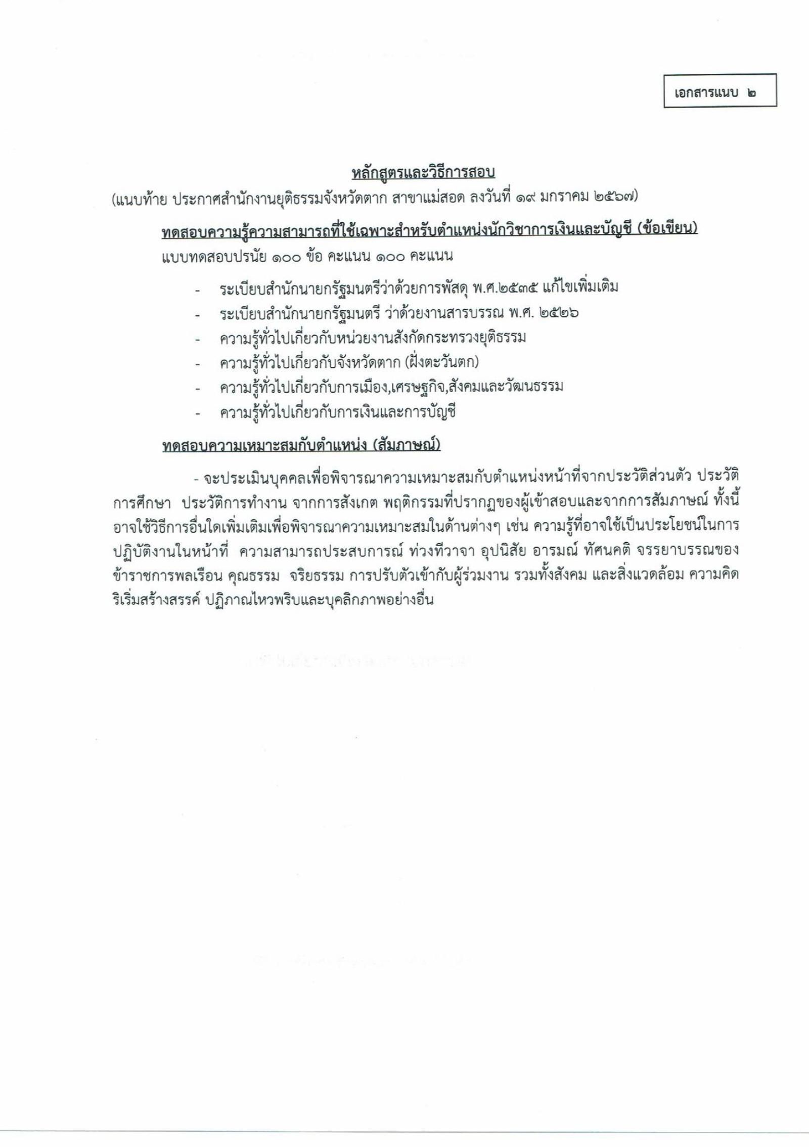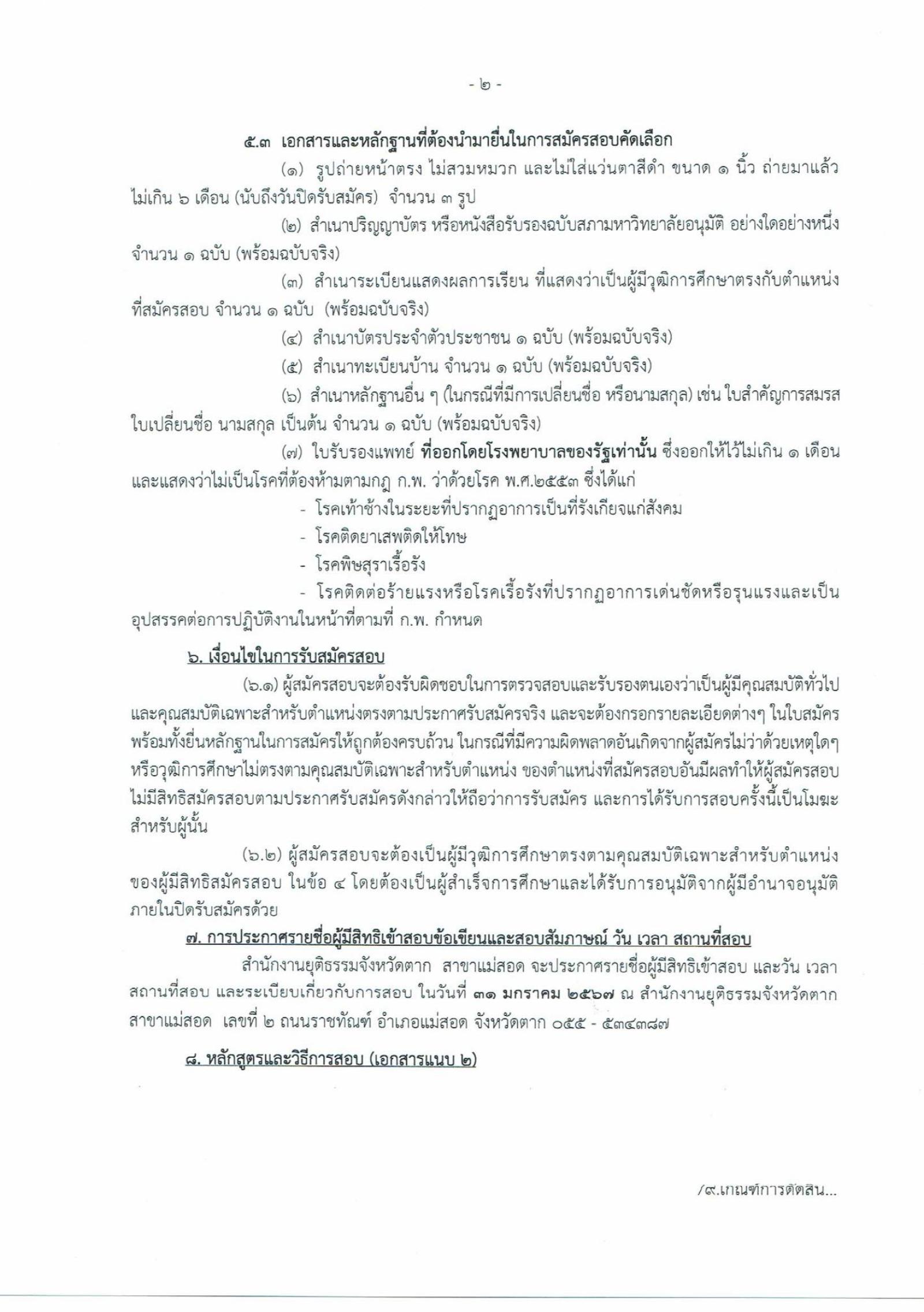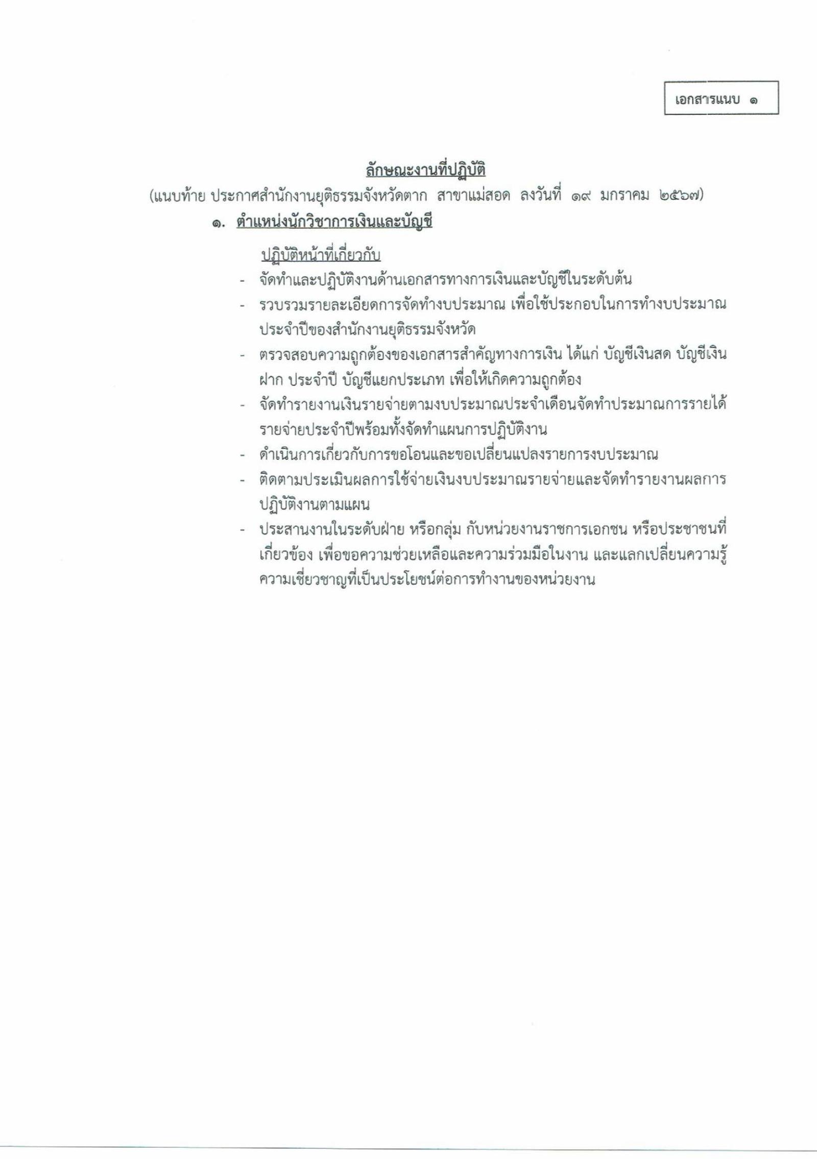 ด้วยสำนักงานยุติธรรมจังหวัดตาก สาขาแม่สอด ประกาศรับสมัครบุคคลเข้าปฏิบัติงานเป็นลูกจ้างชั่วคราว เพื่อสนับสนุนการดำเนินงานงานของสำนักงานยุติธรรมจังหวัดตาก สาขาแม่สอด ตำแหน่ง นักวิชาการเงินและบัญชี จำนวน 1 อัตรา (วุฒิปริญญาตรีสาขาการเงินและบัญชี) อัตราค่าจ้างเดือนละ 15,000 บาท ผู้ประสงค์จะสมัครสอบขอและยื่นใบสมัครด้วยตนเองได้ที่ สำนักงานยุติธรรมจังหวัดตาก สาขาแม่สอด เลขที่ 2 ถนนราชทัณฑ์อำเภอแม่สอด จังหวัดตาก ตั้งแต่วันที่ 24 มกราคม 2567 ถึง 30 มกราคม 2567 ในวันและเวลาราชการฯ