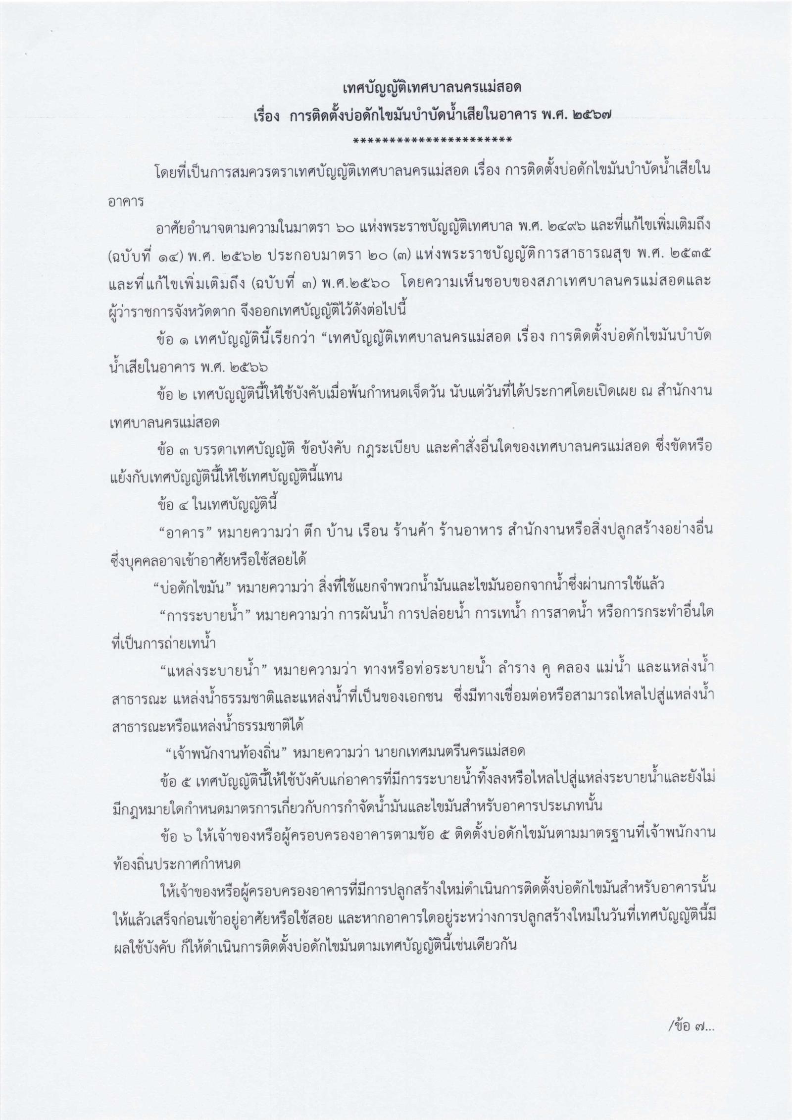 เทศบัญญัติเทศบาลนครแม่สอด เรื่อง การติดตั้งบ่อดักไขมันบำบัดน้ำเสียในอาคาร พ.ศ. 2567 และ ประกาศเทศบาลนครแม่สอด เรื่อง ข้อกำหนดและวิธีการติดตั้งบ่อดักไขมันบำบัดน้ำเสียในอาคาร