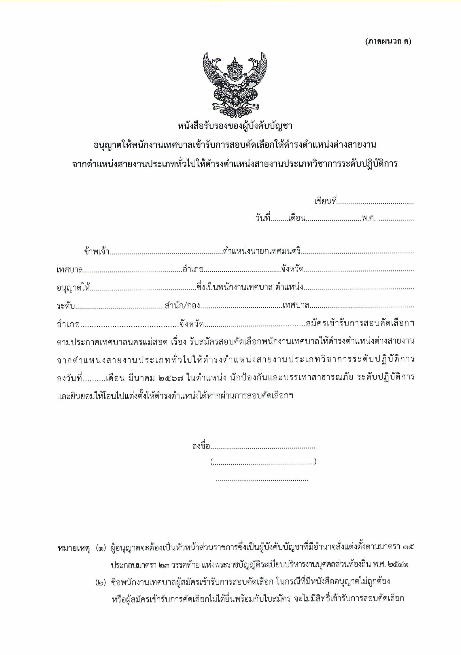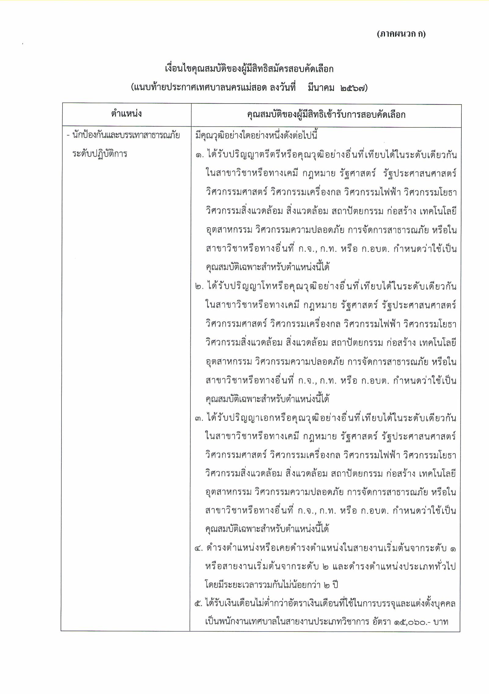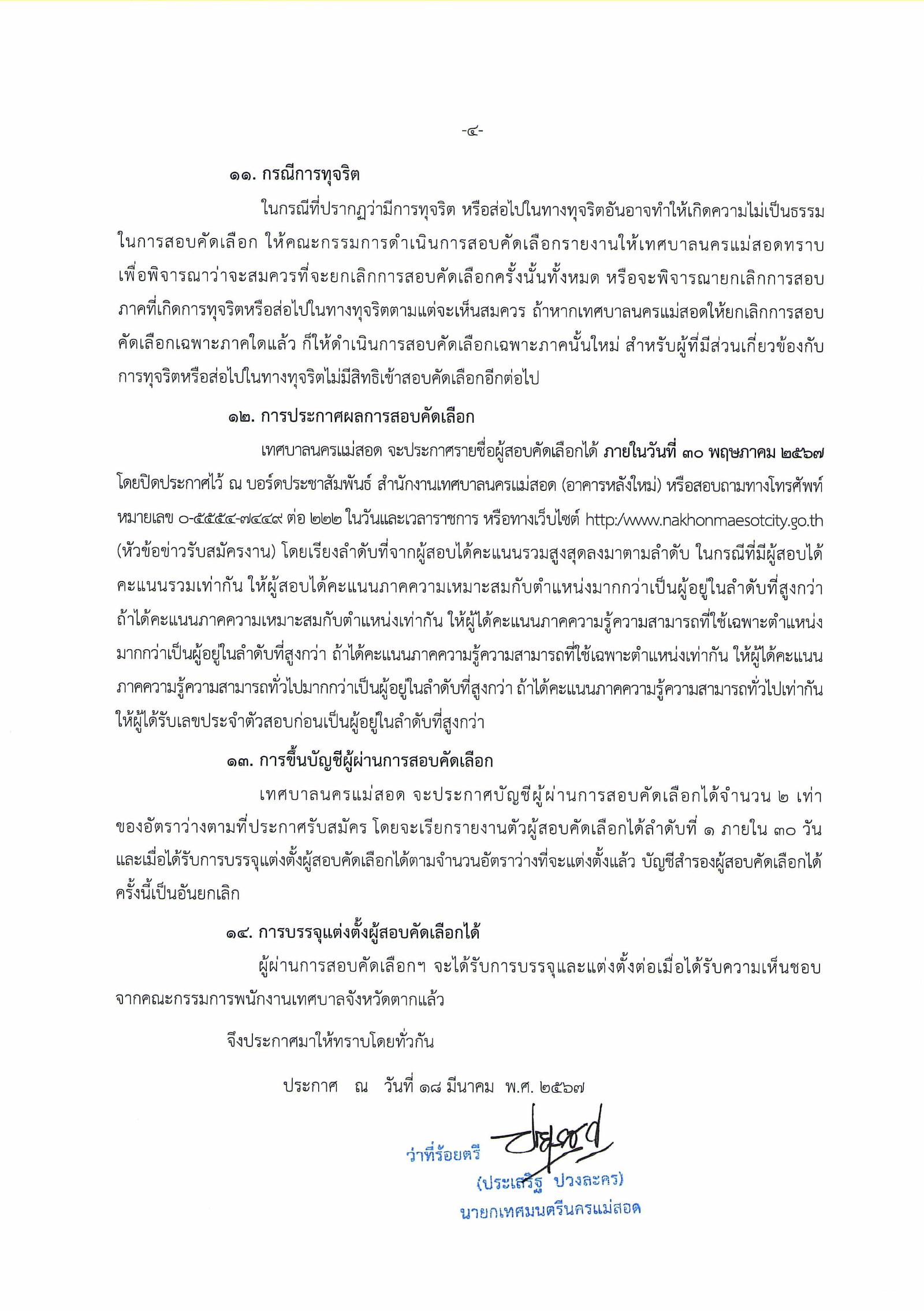 ประกาศเทศบาลนครแม่สอด ลงวันที่ 18 มีนาคม 2567 เรื่อง รับสมัครสอบคัดเลือกพนักงานเทศบาลให้ดำรงตำแหน่งต่างสายงาน จากตำแหน่งสายงานประเภททั่วไปให้ดำรงตำแหน่งสายงานประเภท วิชาการ ระดับปฏิบัติการ