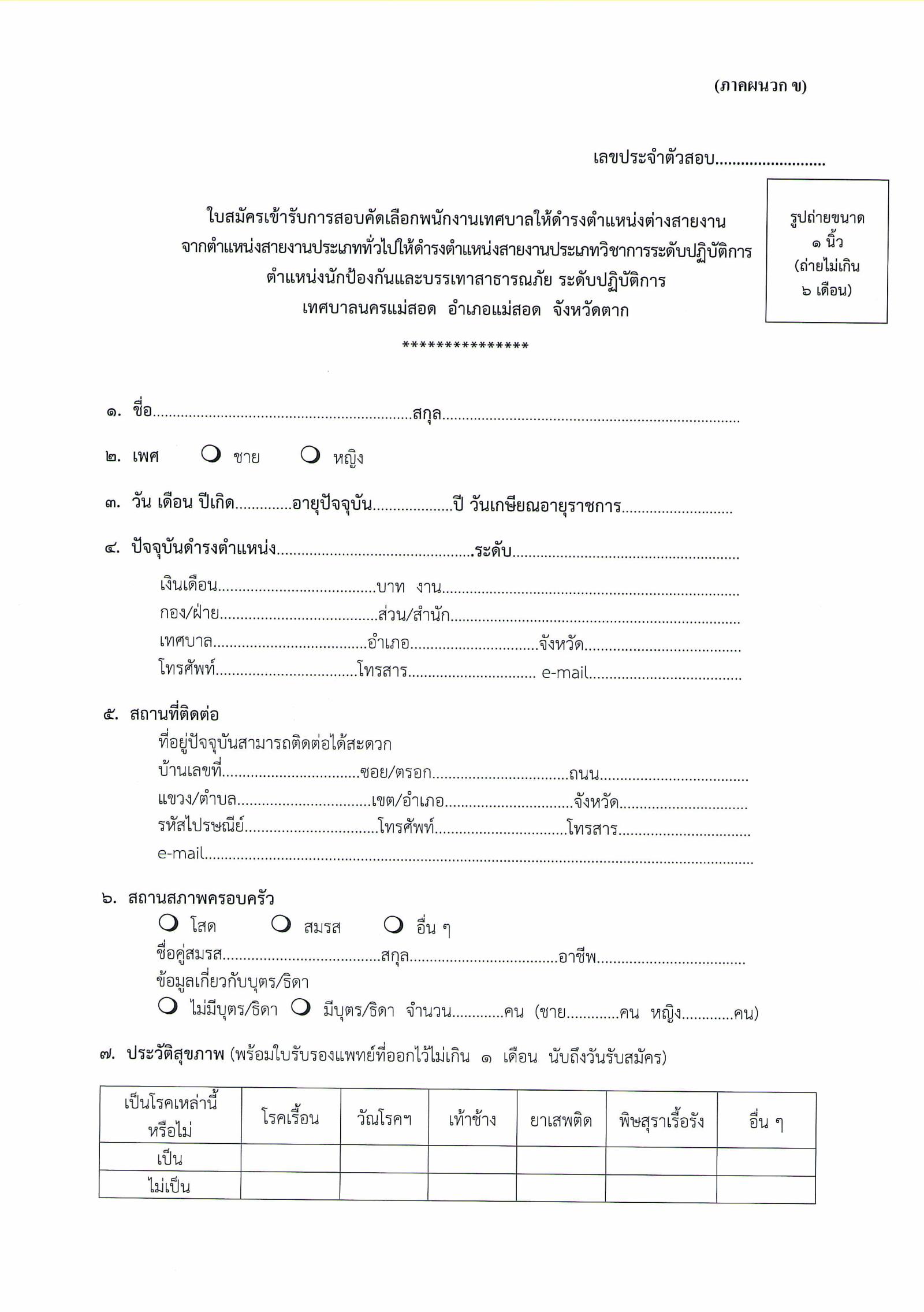 เทศบาลนครแม่สอด รับโอน (ย้าย) พนักงานเทศบาลหรือพนักงานส่วนท้องถิ่นอื่น มาดำรงตำแหน่งที่ว่าง
