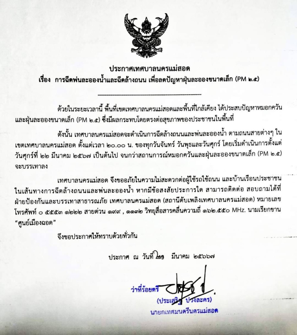 ประกาศเทศบาลนครแม่สอด เรื่อง การฉีดพ่นละอองน้ำและฉีดล้างถนน เพื่อลดปัญหาฝุ่นละอองขนาดเล็ก (PM 2.5)
