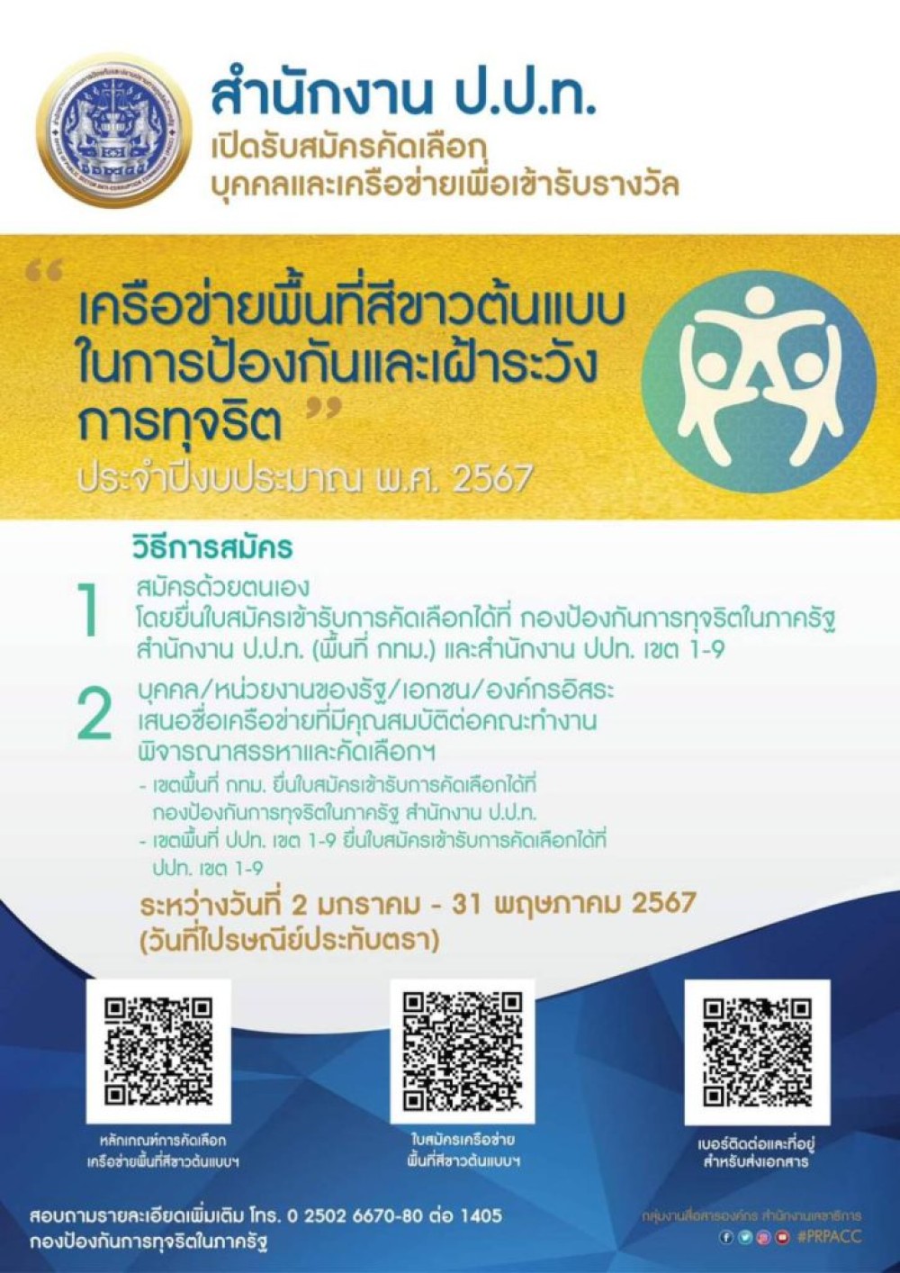 ประชาสัมพันธ์ประกาศรับสมัครการสรรหาและคัดเลือก "เครือข่ายพื้นที่สีขาวต้นแบบในการป้องกันและเฝ้าระวังการทุจริต ประจำปี พ.ศ. 2567"