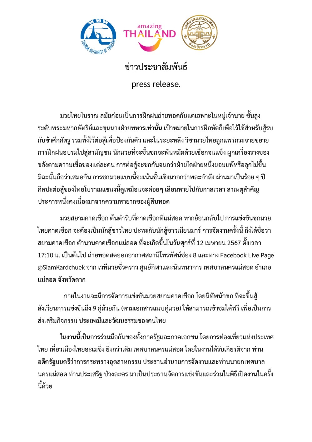 เชิญชมงานการแข่งขันมวยโบราณ "สยามคาดเชือก ตำนานคาดเชือกแม่สอด" วันศุกร์ที่ 12 เมษายน 2567