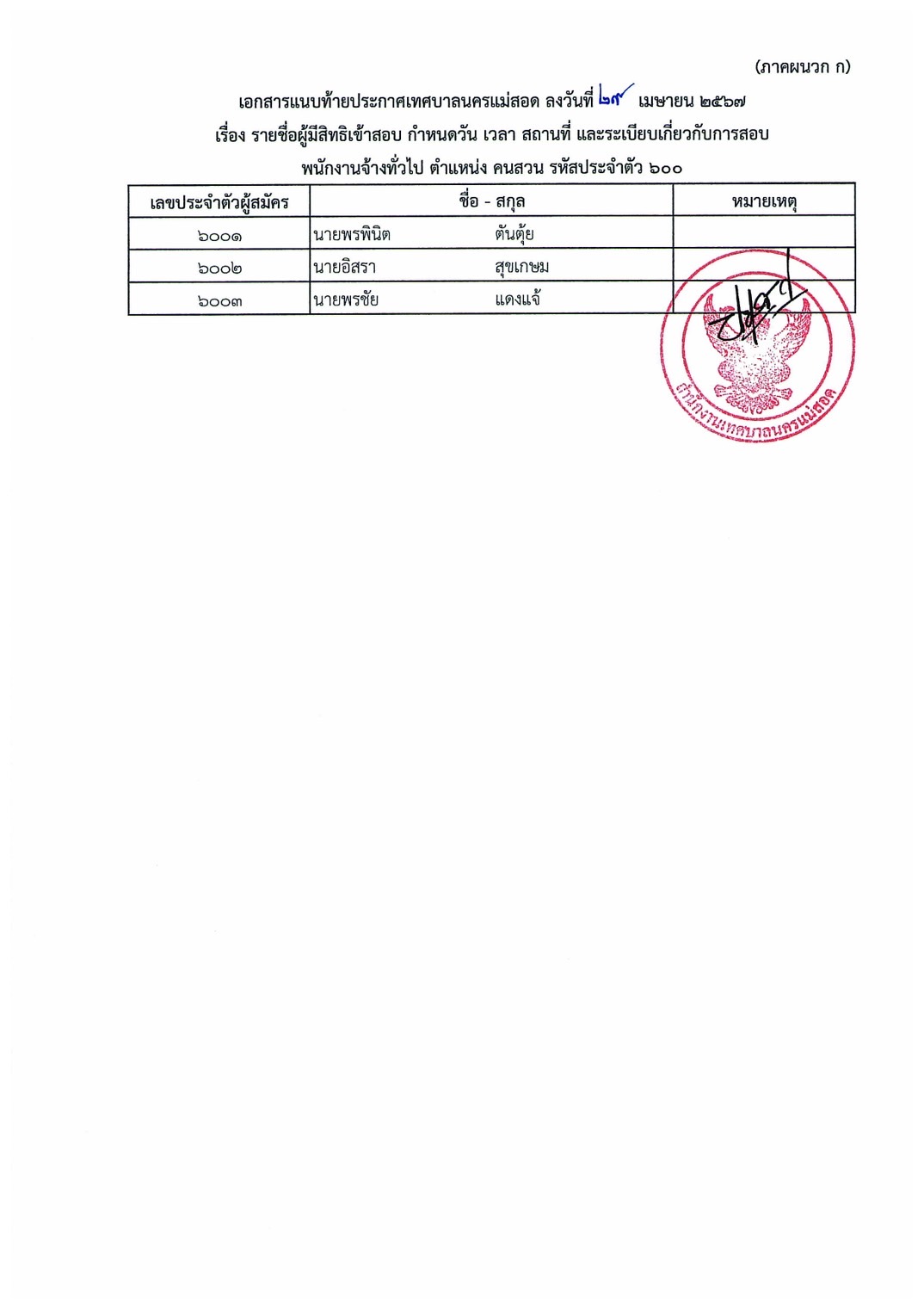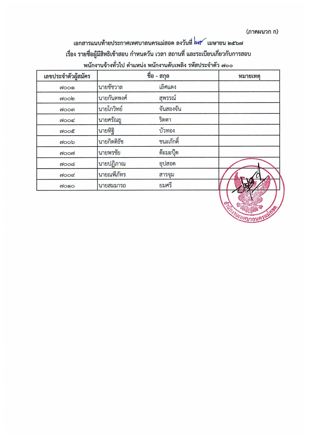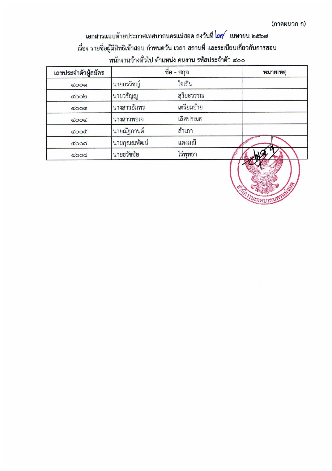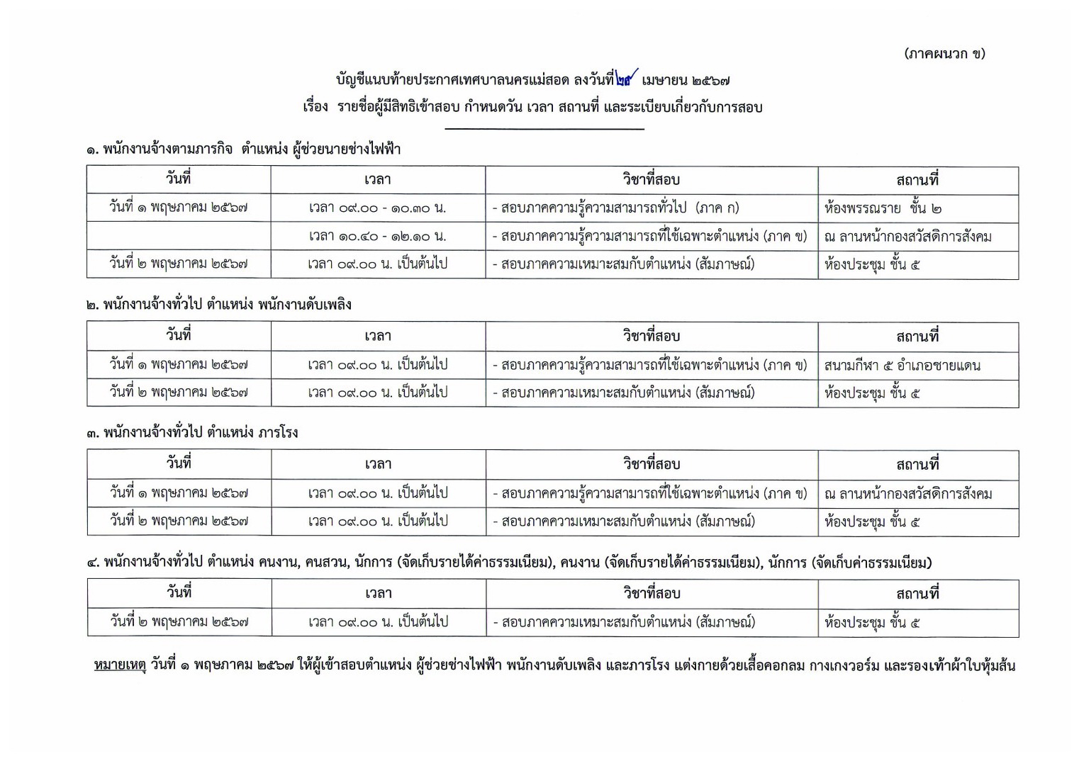ประกาศเทศบาลนครแม่สอด เรื่อง รายชื่อผู้มีสิทธิเข้าสอบ กำหนดวัน เวลา สถานที่ และระเบียบเกี่ยวกับการสอบ (พนักงานจ้าง จำนวน 6 ตำแหน่ง 13 อัตรา)