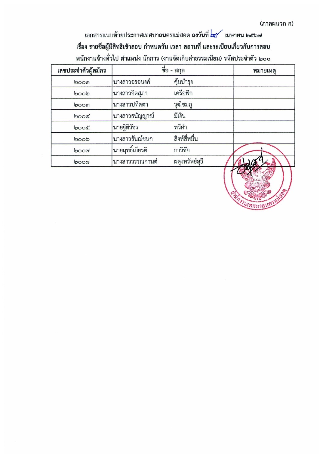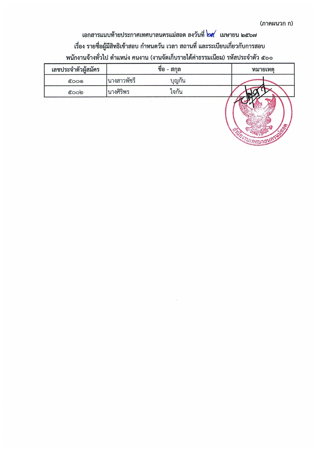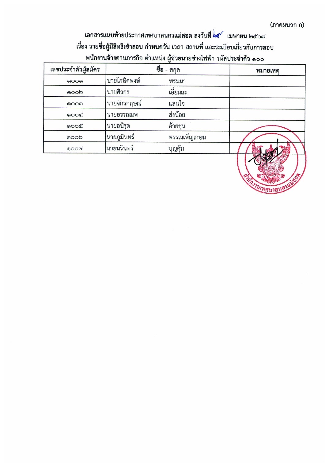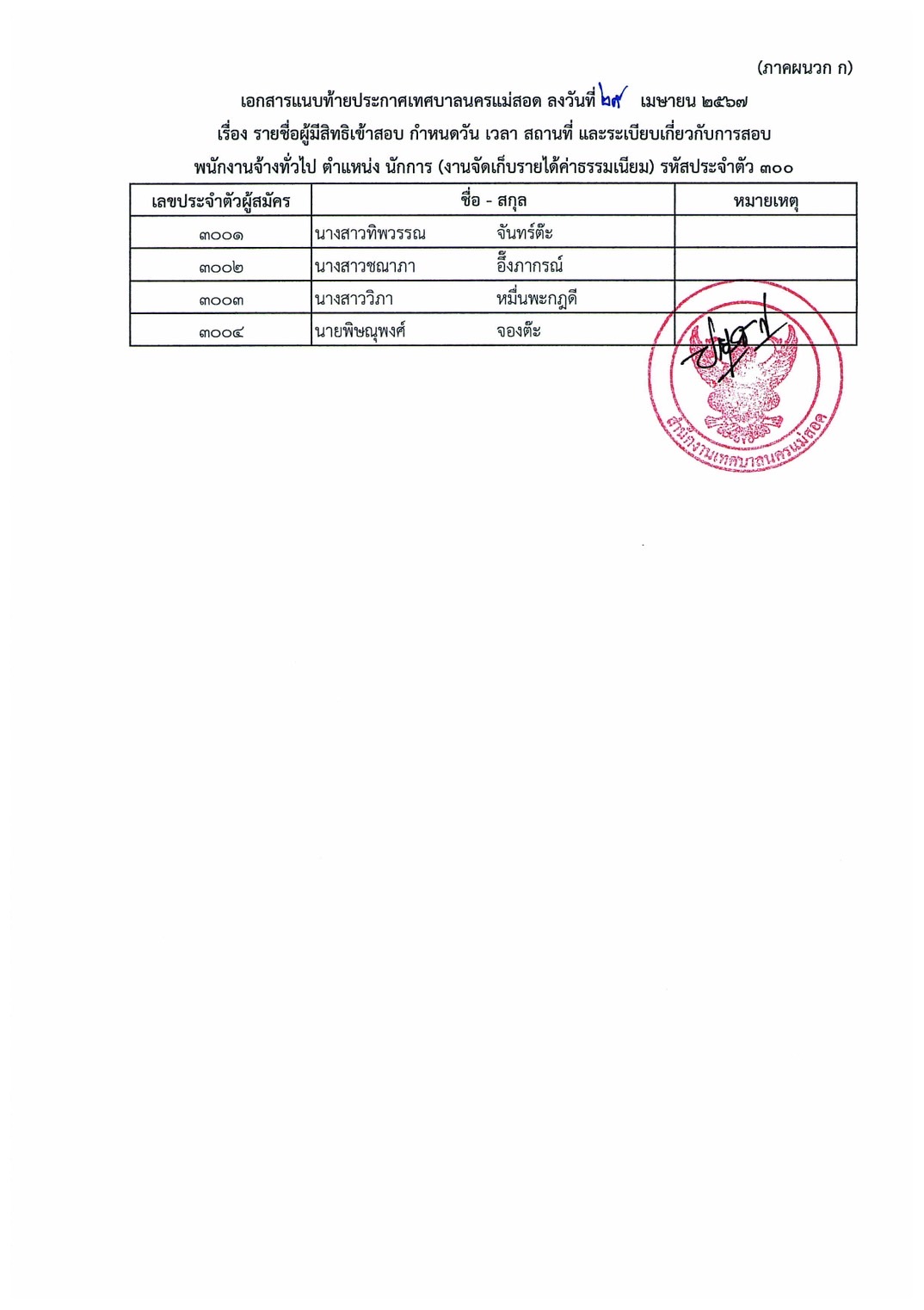 ประกาศเทศบาลนครแม่สอด เรื่อง รายชื่อผู้มีสิทธิเข้าสอบ กำหนดวัน เวลา สถานที่ และระเบียบเกี่ยวกับการสอบ (พนักงานจ้าง จำนวน 6 ตำแหน่ง 13 อัตรา)