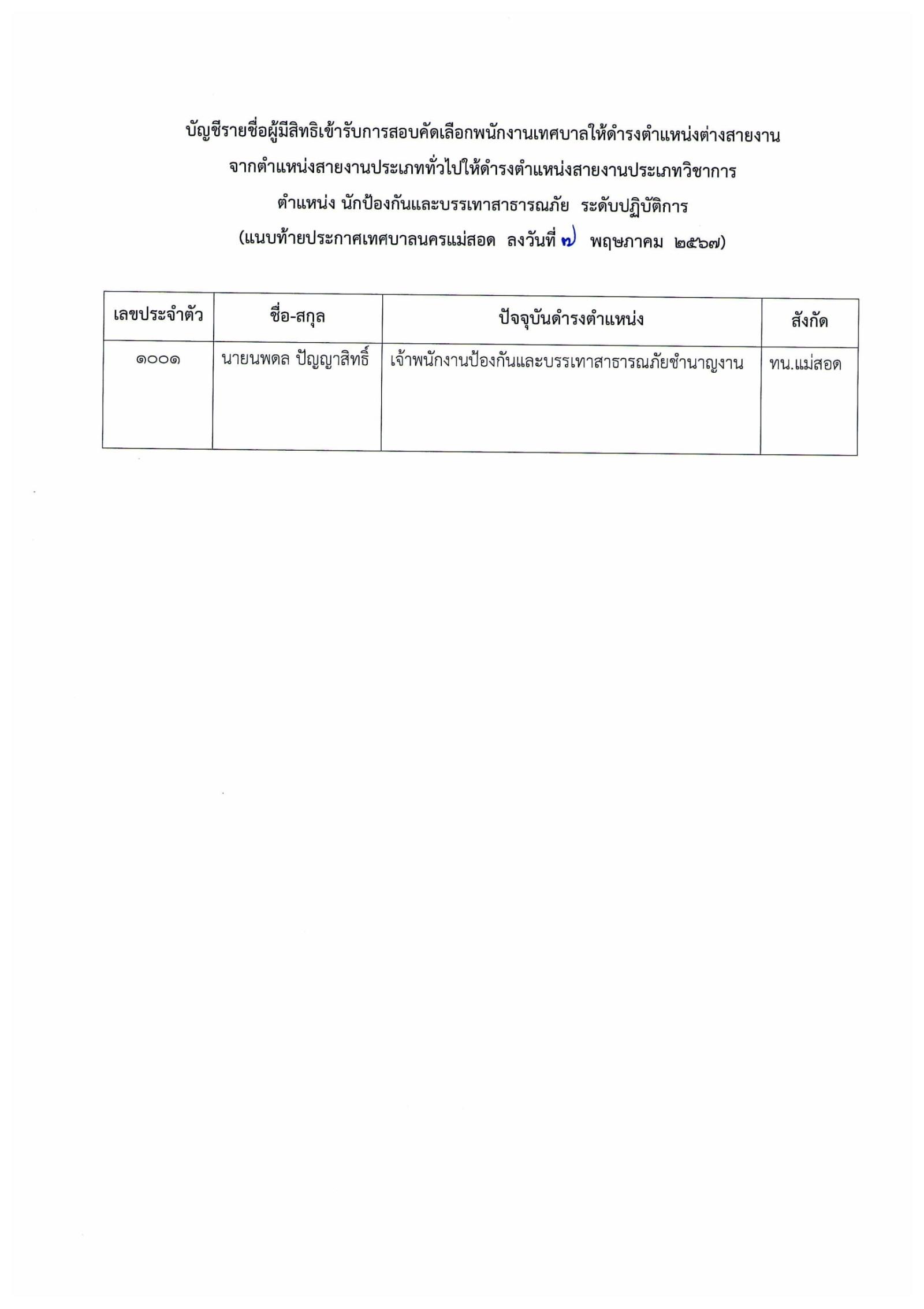 ประกาศเทศบาลนครแม่สอด เรื่อง รายชื่อผู้ผ่านการสอบคัดเลือกเพื่อแต่งตั้งให้ดำรงตำแหน่งต่างสายงาน จากตำแหน่งสายงานประเภททั่วไป ให้ดำรงตำแหน่งสายงานประเภทวิชาการ ตำแหน่ง นักจัดการงานทั่วไป ระดับปฏิบัติการ