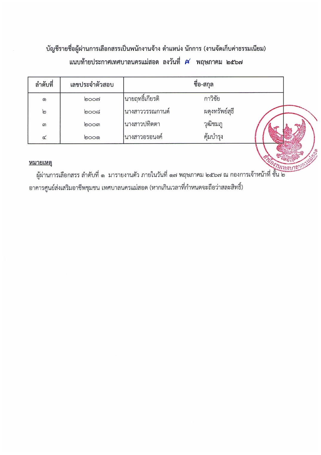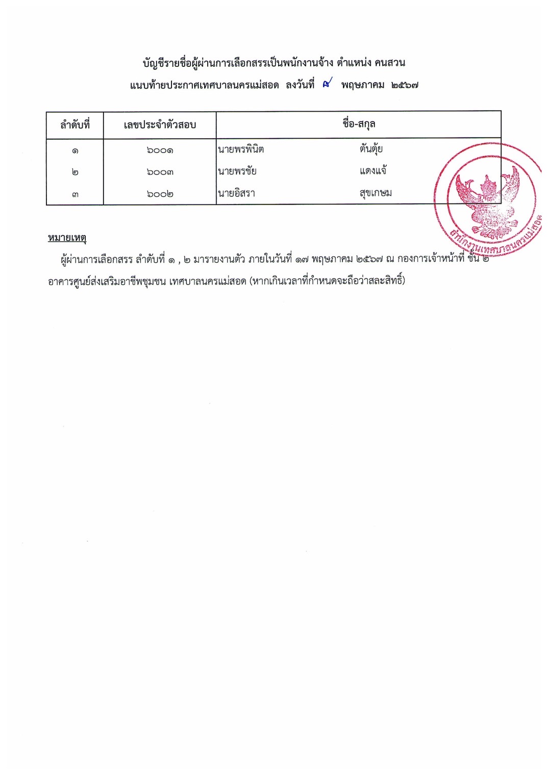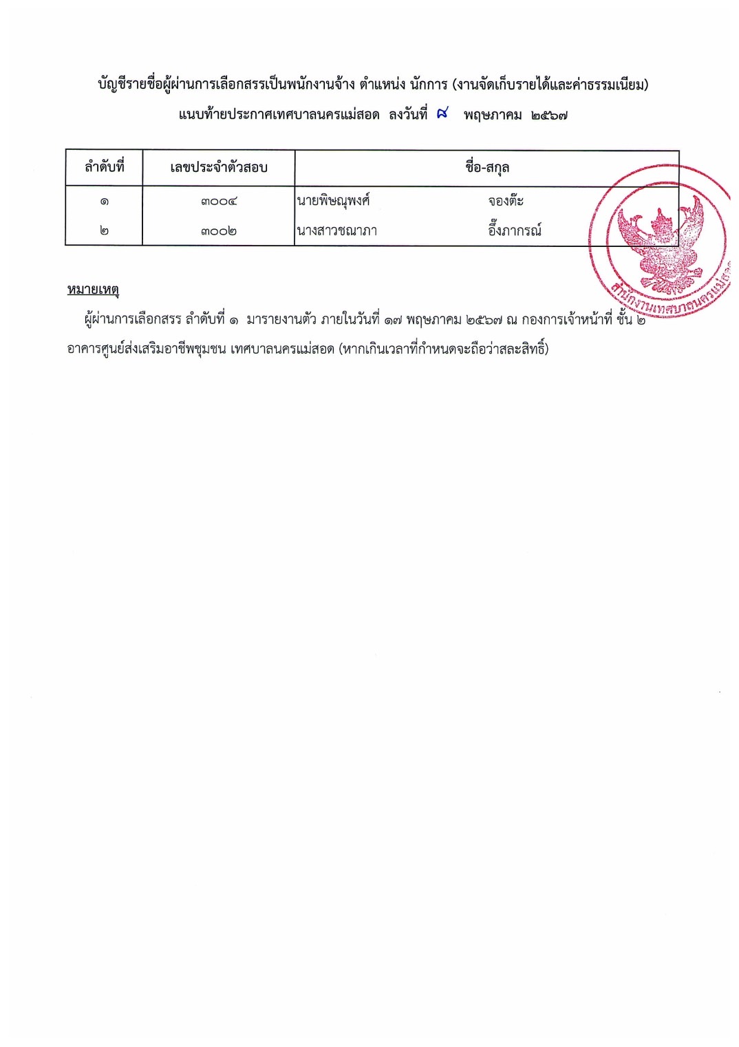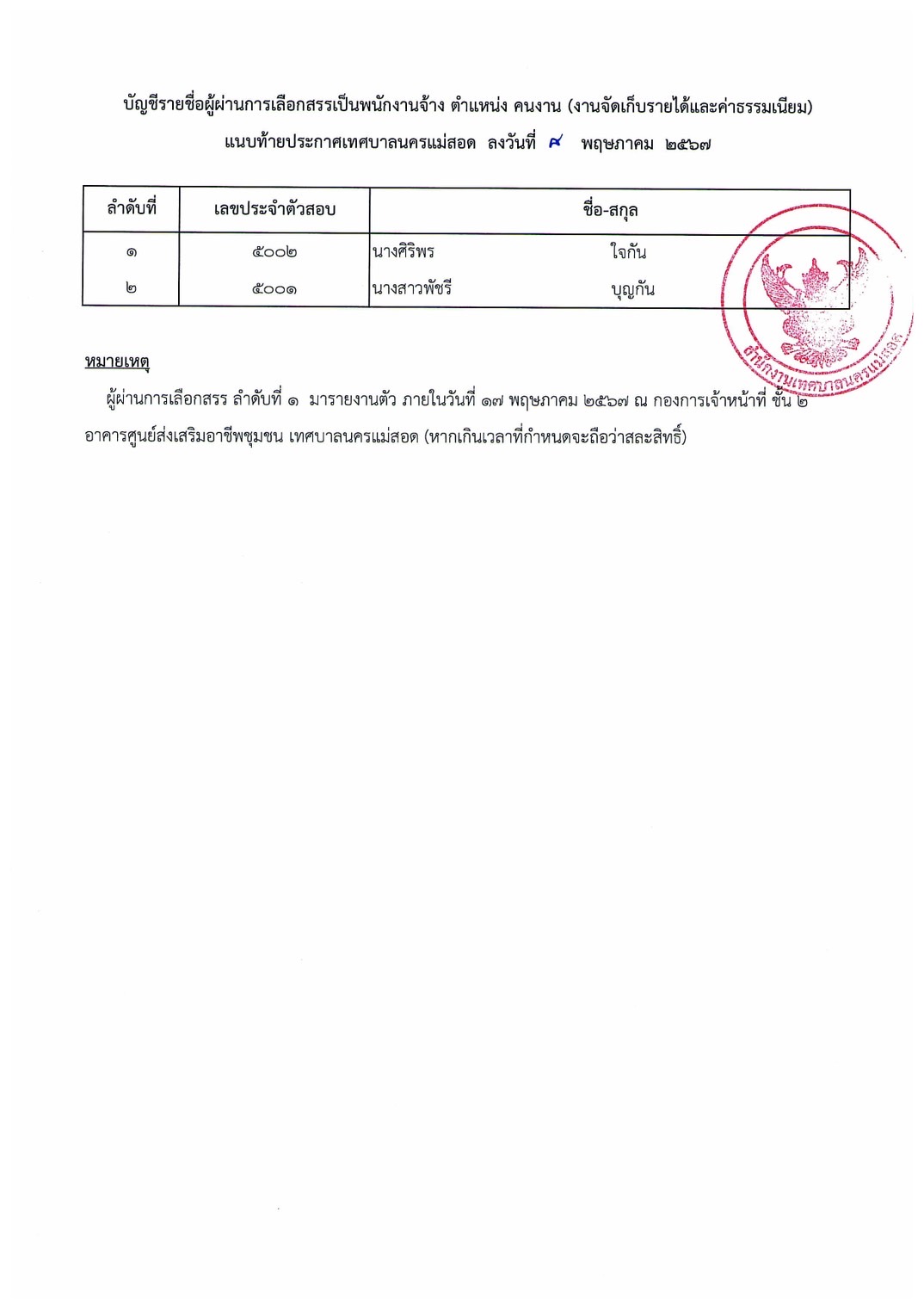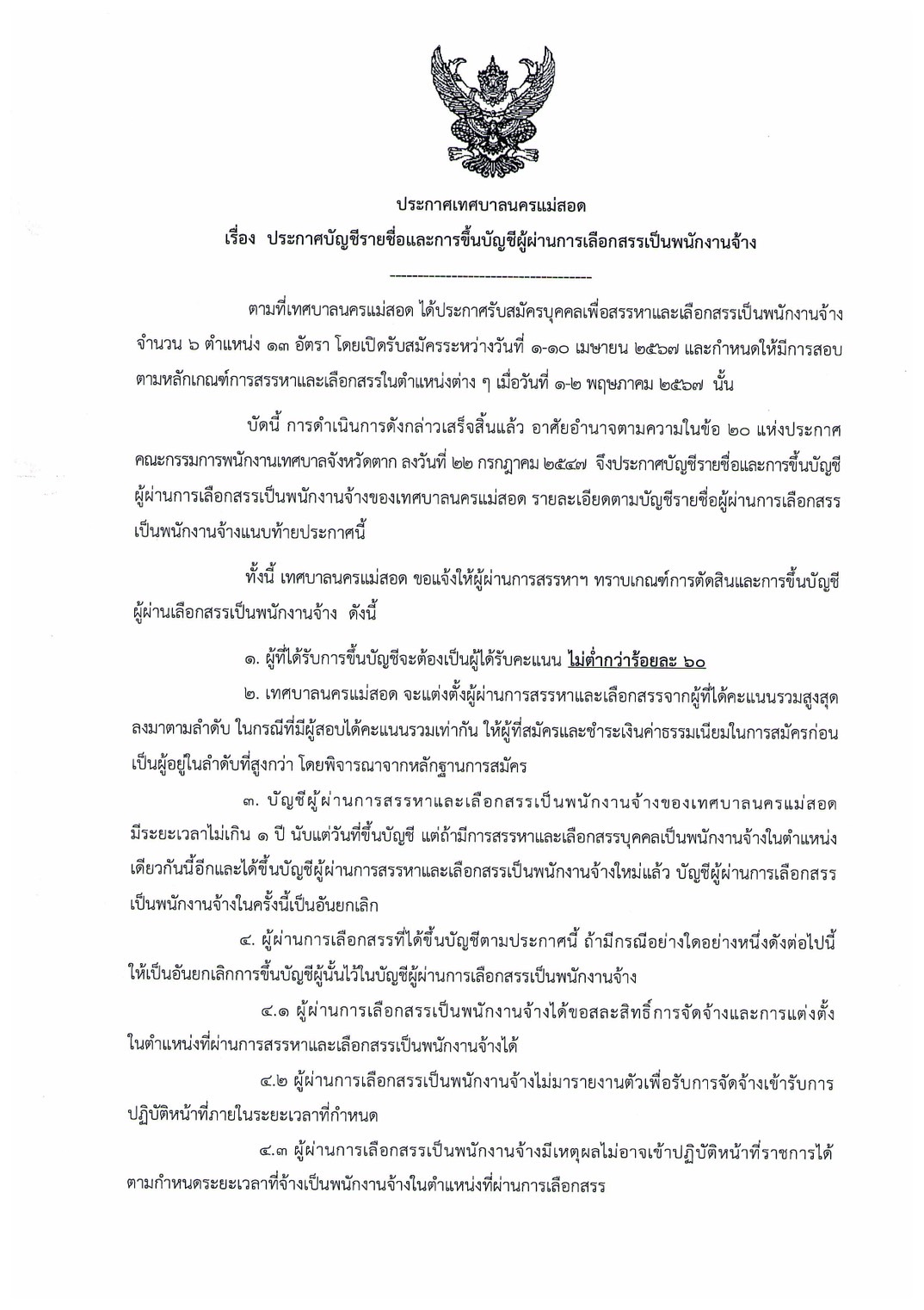 ประกาศเทศบาลนครแม่สอด เรื่อง ประกาศบัญชีรายชื่อและการขึ้นบัญชีผู้ผ่านการเลือกสรรเป็นพนักงานจ้าง