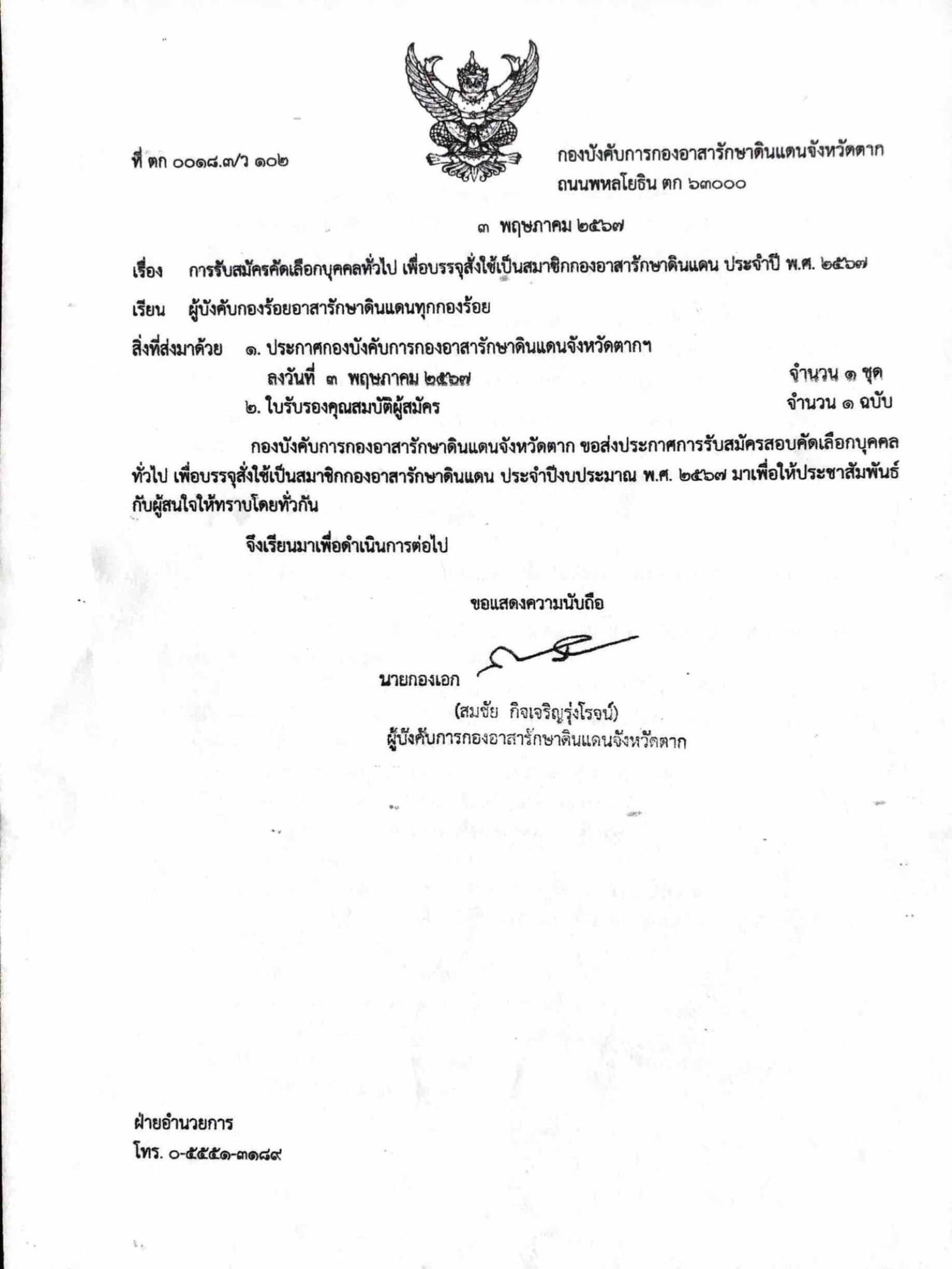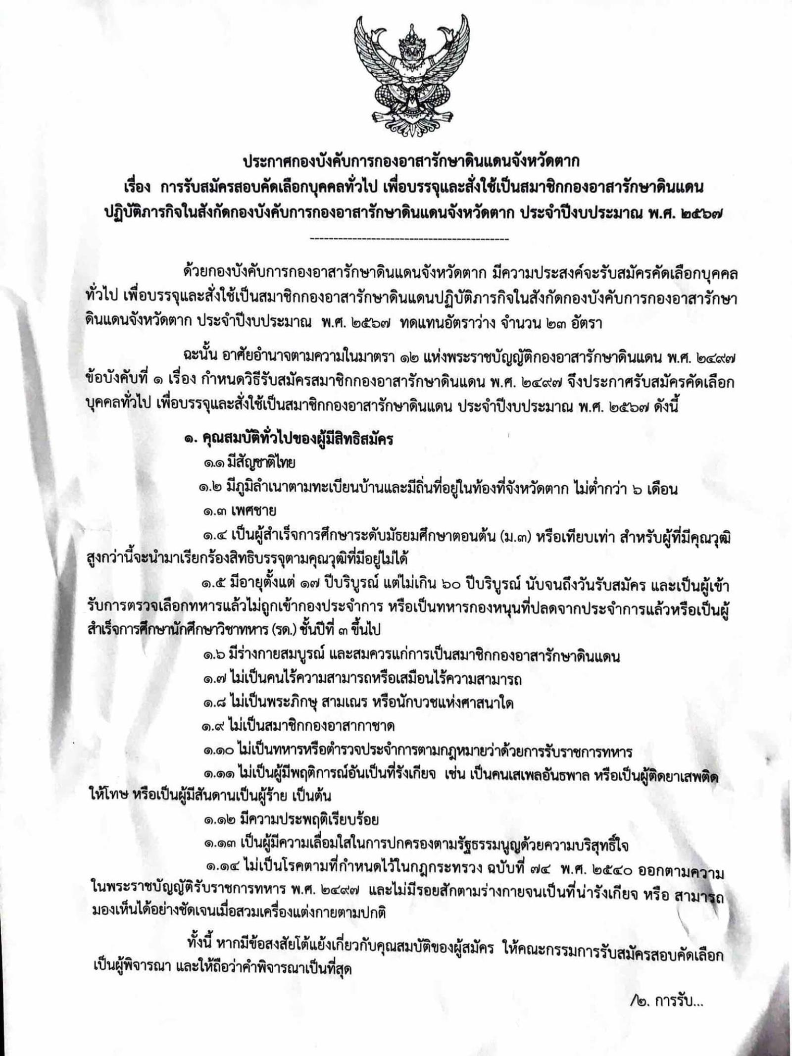 กองร้อยอาสารักษาดินแดนอำเภอแม่สอด ที่ 3 รับสมัครคัดเลือกบุคคลทั่วไป เพื่อบรรจุสั่งใช้เป็นสมาชิกกองอาสารักษาดินแดน ประจำปี พ.ศ. 2567