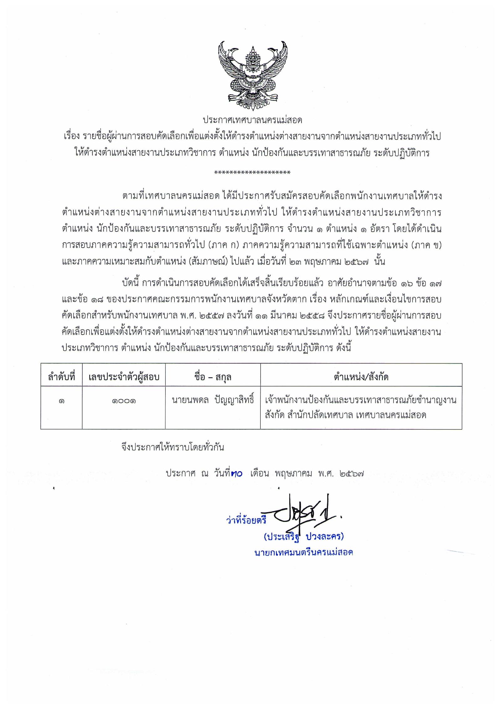 ประกาศเทศบาลนครแม่สอด เรื่อง รายชื่อผู้ผ่านการสอบคัดเลือกเพื่อแต่งตั้งให้ดำรงตำแหน่งต่างสายงาน จากตำแหน่งสายงานประเภททั่วไป ให้ดำรงตำแหน่งสายงานประเภทวิชาการ ตำแหน่ง นักจัดการงานทั่วไป ระดับปฏิบัติการ
