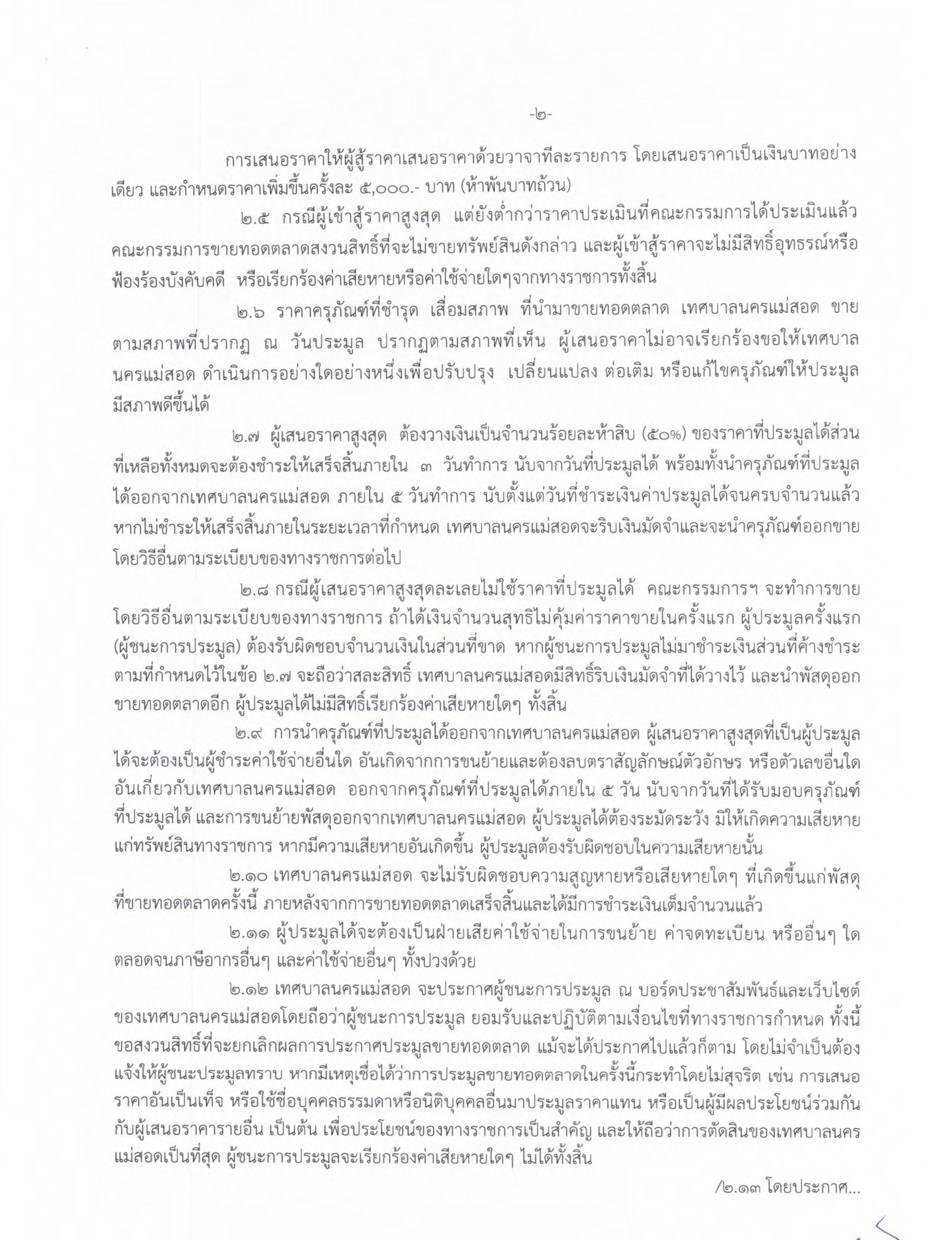 เทศบาลนครแม่สอด ขอประชาสัมพันธ์ การขายทอดตลาดพัสดุที่มีสภาพชำรุด จำนวน 4 รายการ ในวันพฤหัสบดีที่ 18 ธันวาคม 2568 โดยเริ่มประมูลตั้งแต่เวลาตั้งแต่เวลา 09.00 - 10.00 น. ณ ที่ทำการด่านศุลกากรแม่สอด
