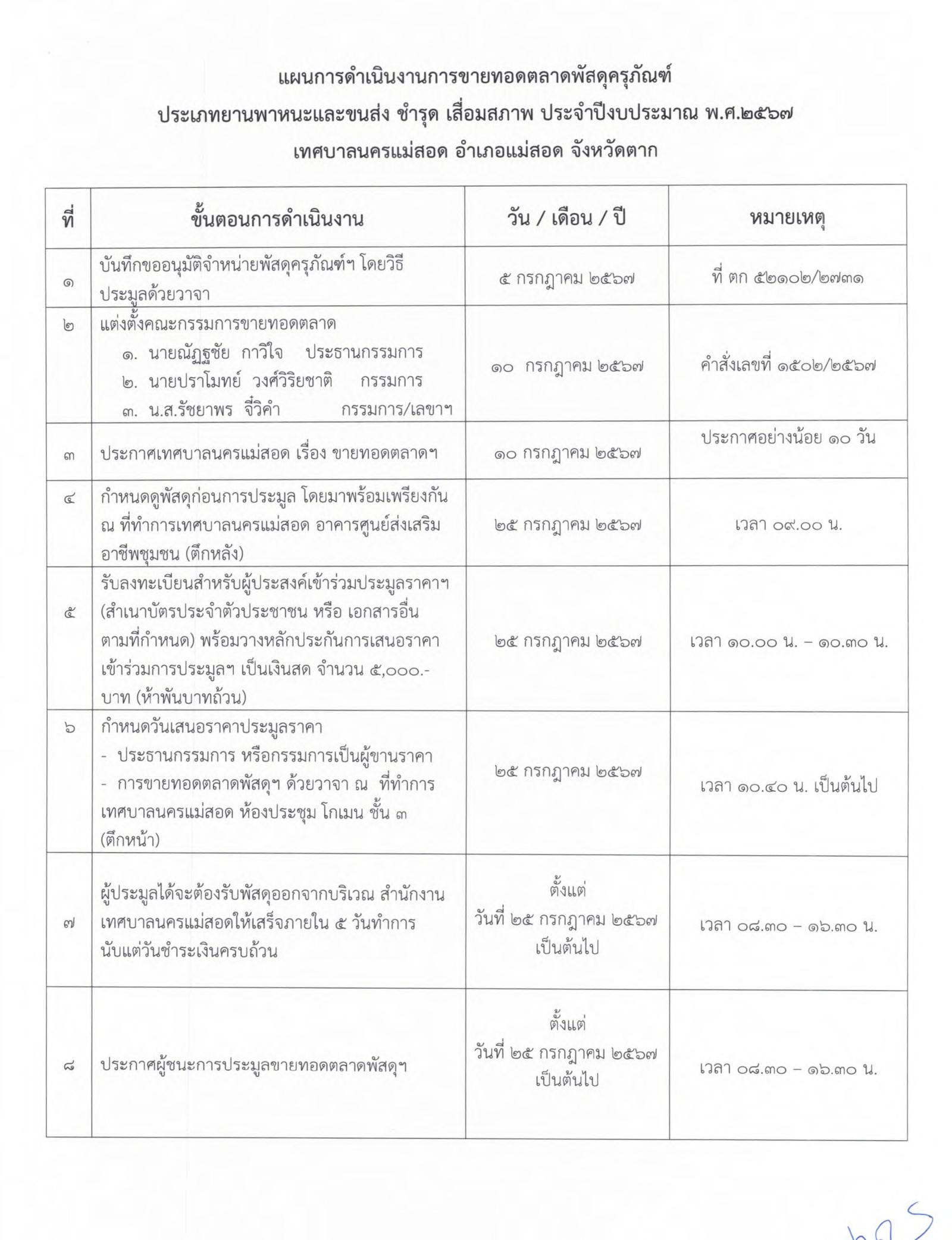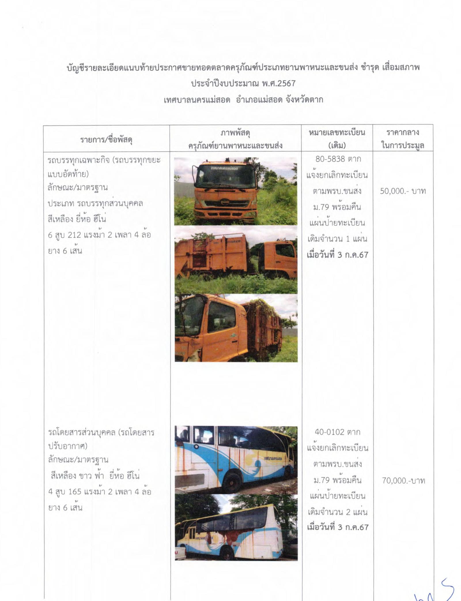 ประกาศเทศบาลนครแม่สอด เรื่อง ขายทอดตลาดพัสดุครุภัณฑ์ประเภทยานพาหนะและขนส่งชำรุด เสื่อมสภาพ ประจำปีงบประมาณ พ.ศ.2567