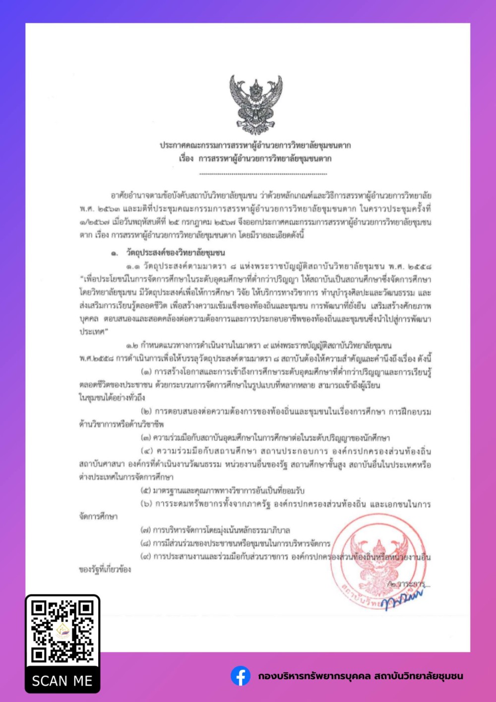 ประกาศคณะกรรมการสรรหาผู้อำนวยการวิทยาลัยชุมชนตาก เรื่องการสรรหาผู้อำนวยการวิทยาลัยชุมชนตาก