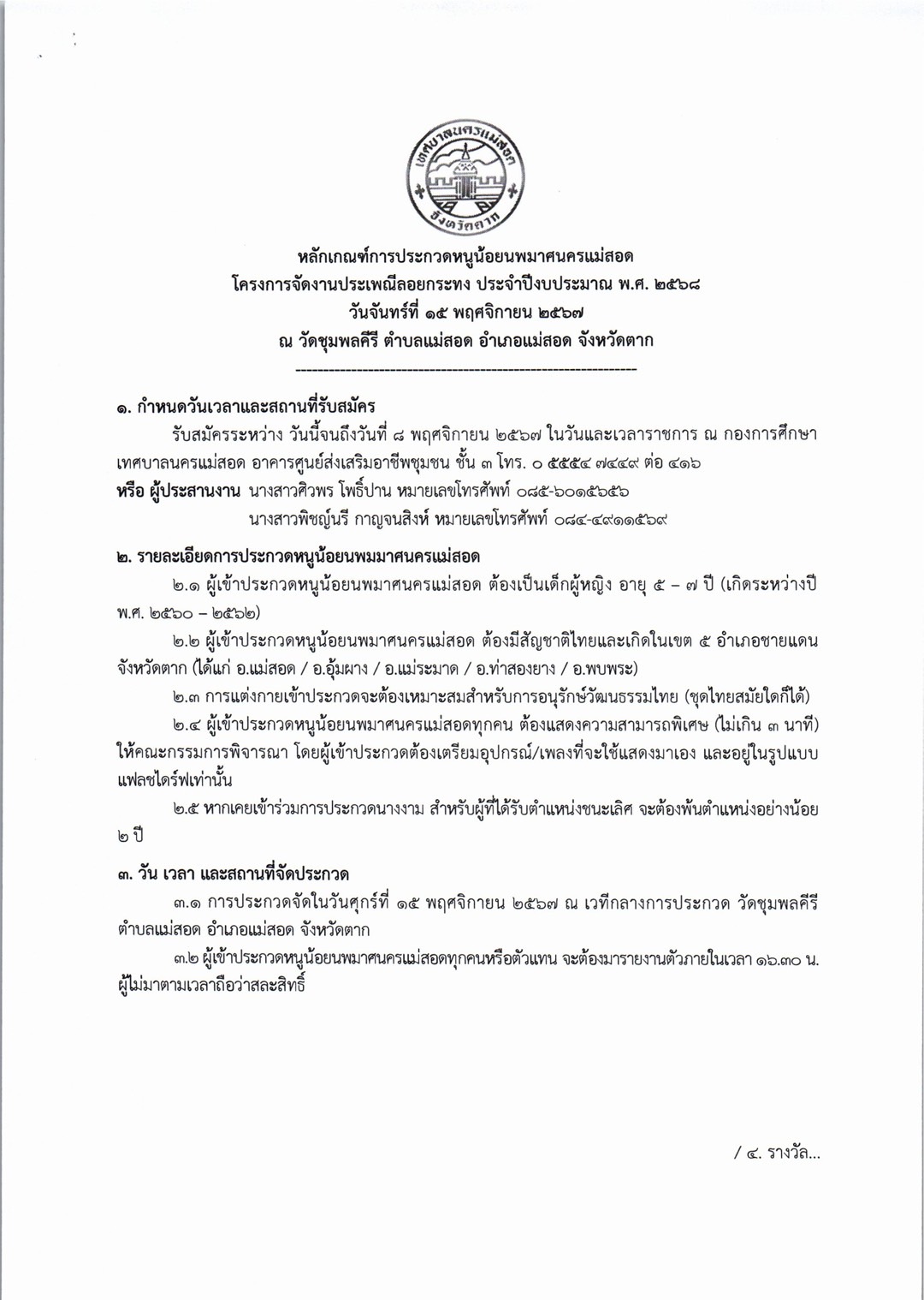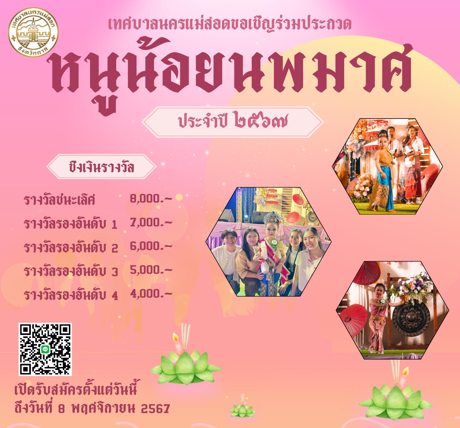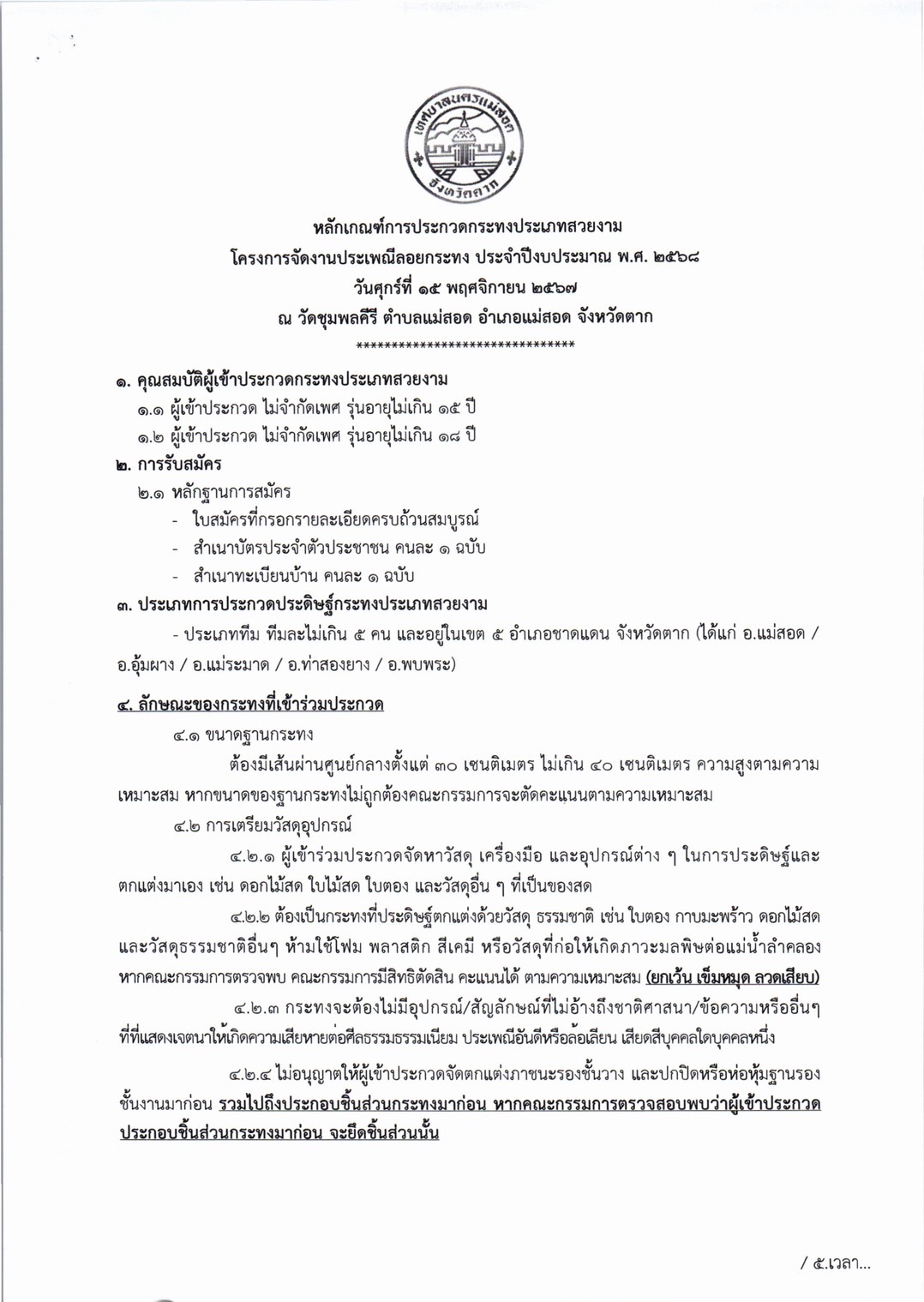 การจัดโครงการจัดงานประเพณีลอยกระทง ประจำปีงบประมาณ พ.ศ. 2568 ในวันศุกร์ที่ 15 พฤศจิกายน 2567 (เชิญชวนผู้ที่สนใจเข้าร่วมกิจกรรมฯ) ดังนี้ 1. ประกวดกระทงประเภทสวยงาม รุ่นไม่เกิน 15 ปี และไม่เกิน 18 ปี 2. การประกวดหนูน้อยนพมาศนครแม่สอด โดยเปิดรับสมัคร ตั้งแต่บัดนี้ ถึง วันที่ 8 พฤศจิกายน 2567 *กำหนดการโครงการฯ *หลักเกณฑ์การประกวดกระทงสวยงาม/ใบสมัครเข้าร่วมประกวดกระทง *หลักเกณฑ์การประกวดหนูน้อยนพมาศนครแม่สอด/ใบสมัครเข้าร่วมประกวดหนูน้อยนพมาศนครแม่สอด รายละเอียดดาวน์โหลดได้ตามเอกสารด้านล่างนี้