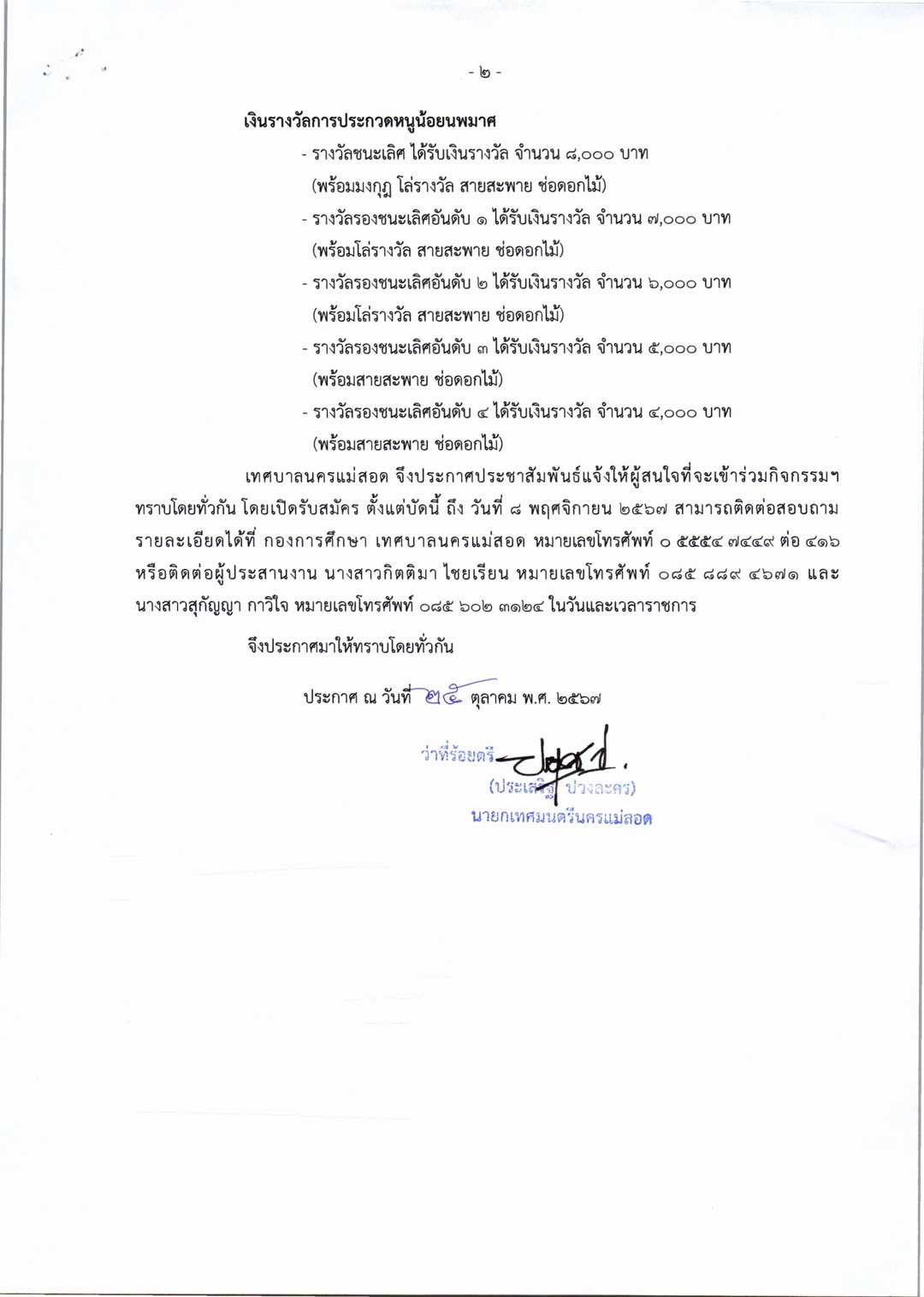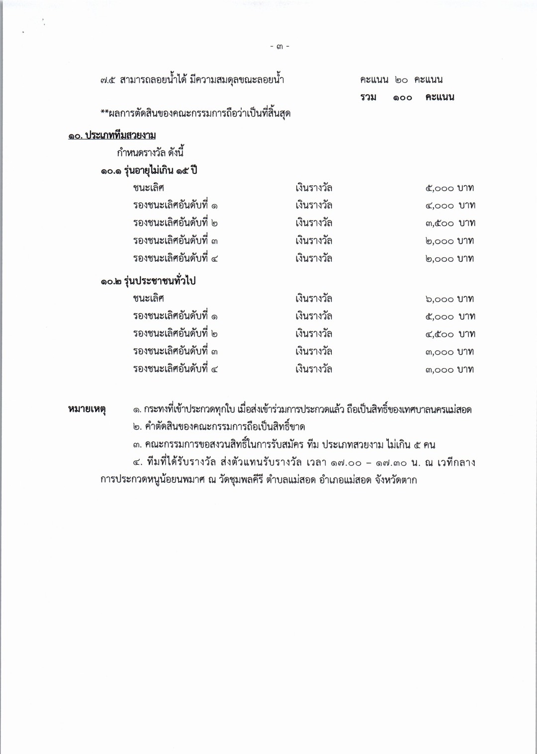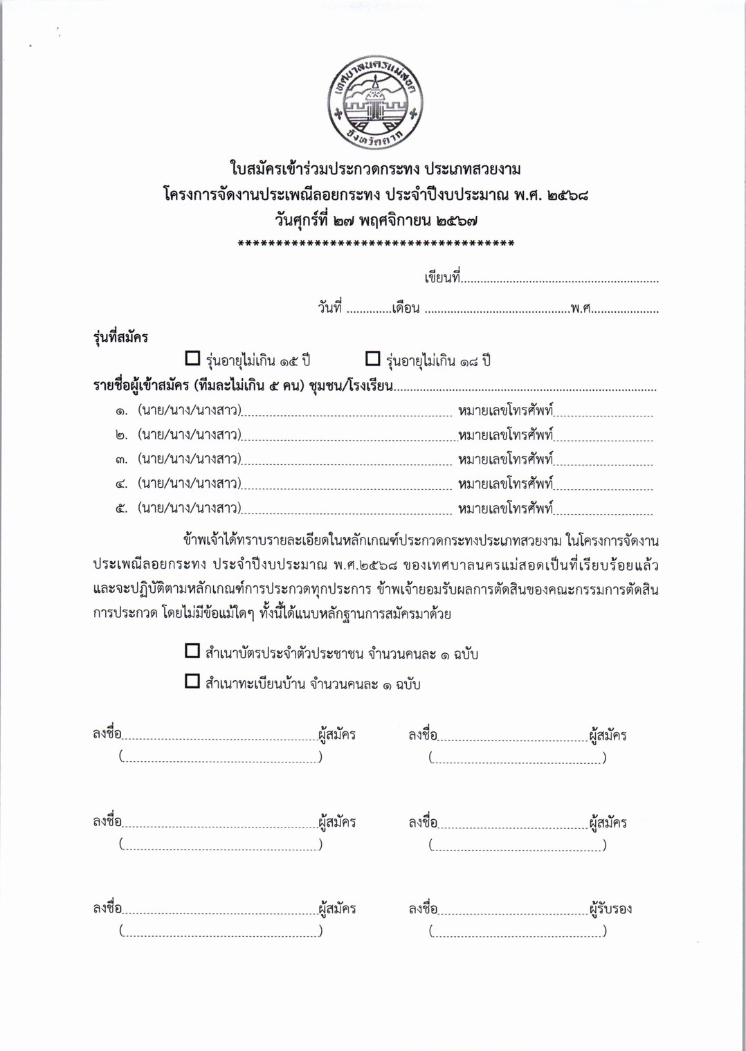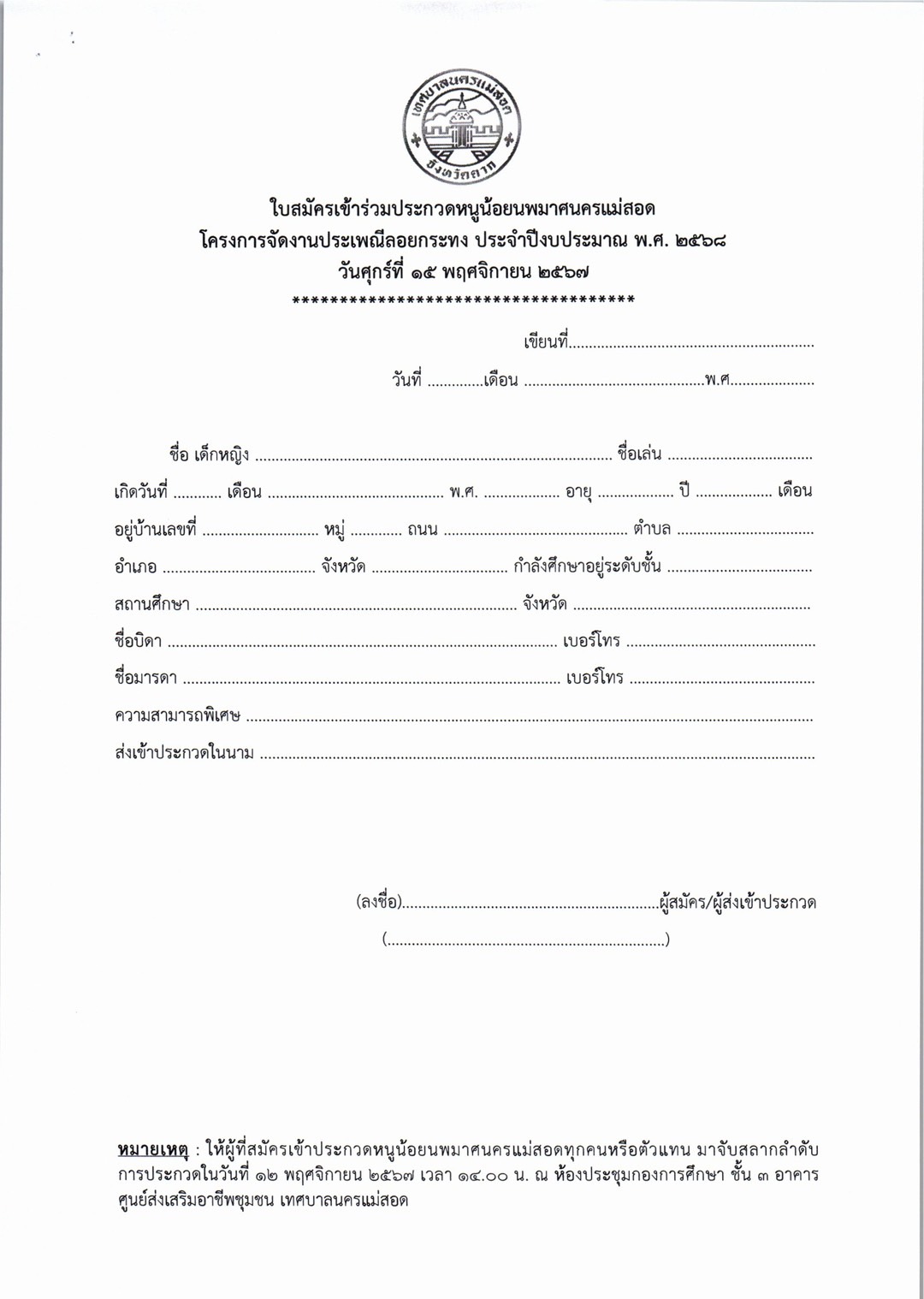 การจัดโครงการจัดงานประเพณีลอยกระทง ประจำปีงบประมาณ พ.ศ. 2568 ในวันศุกร์ที่ 15 พฤศจิกายน 2567 (เชิญชวนผู้ที่สนใจเข้าร่วมกิจกรรมฯ) ดังนี้ 1. ประกวดกระทงประเภทสวยงาม รุ่นไม่เกิน 15 ปี และไม่เกิน 18 ปี 2. การประกวดหนูน้อยนพมาศนครแม่สอด โดยเปิดรับสมัคร ตั้งแต่บัดนี้ ถึง วันที่ 8 พฤศจิกายน 2567 *กำหนดการโครงการฯ *หลักเกณฑ์การประกวดกระทงสวยงาม/ใบสมัครเข้าร่วมประกวดกระทง *หลักเกณฑ์การประกวดหนูน้อยนพมาศนครแม่สอด/ใบสมัครเข้าร่วมประกวดหนูน้อยนพมาศนครแม่สอด รายละเอียดดาวน์โหลดได้ตามเอกสารด้านล่างนี้