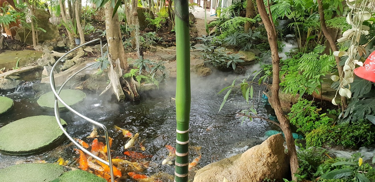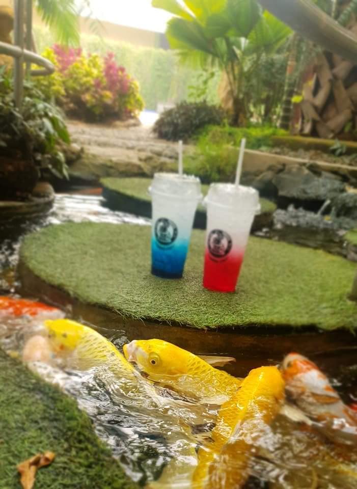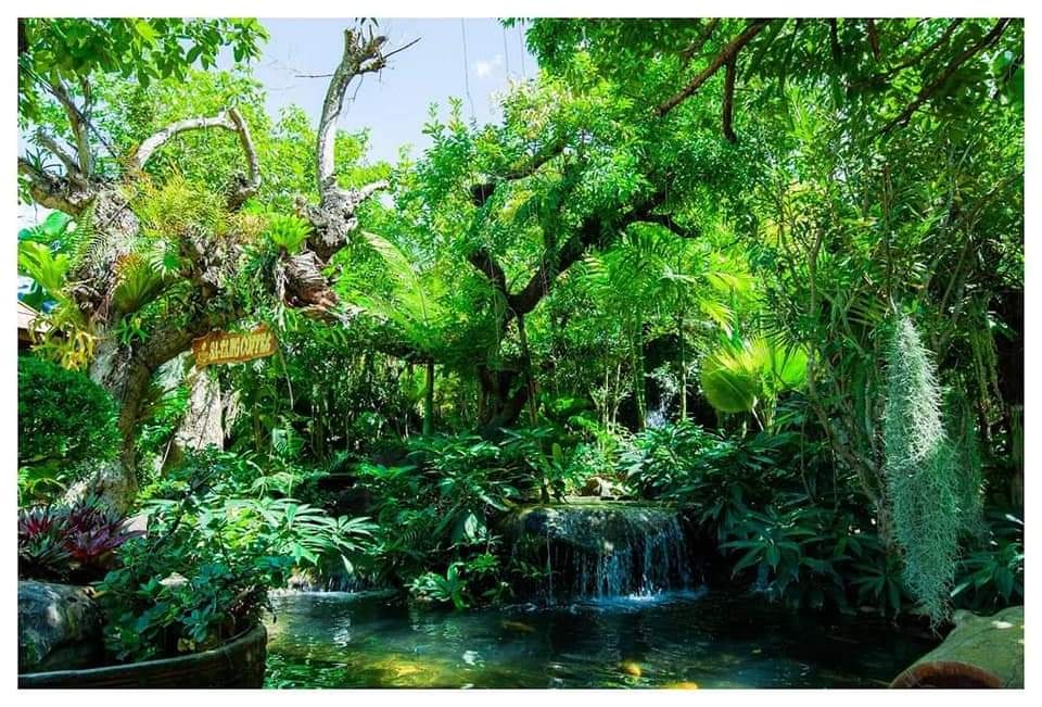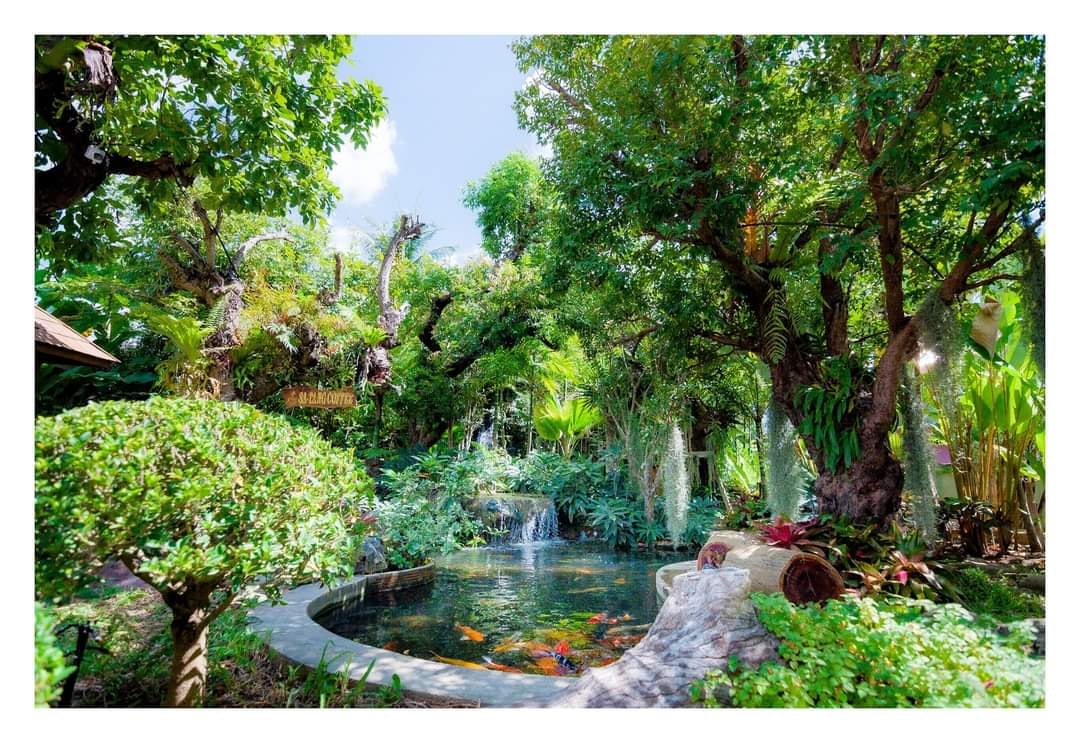 ร้านกาแฟที่รายล้อมไปด้วยต้นไม้ น้ำตก และฝูงปลา