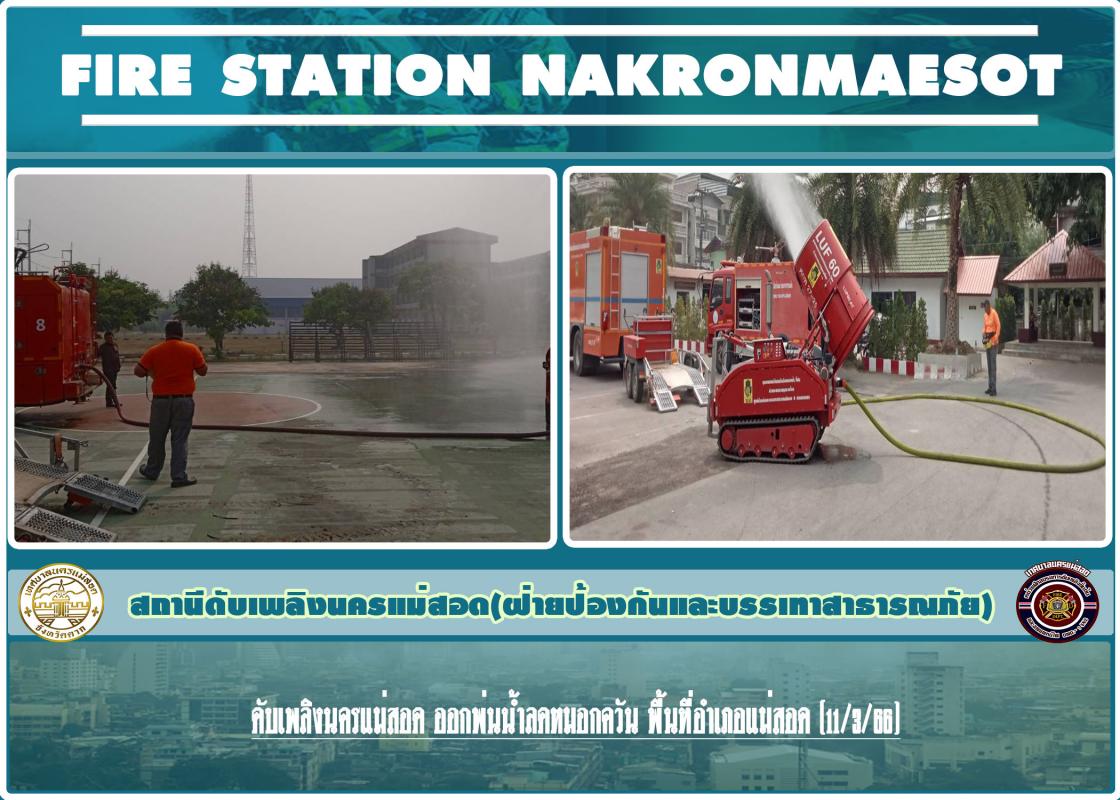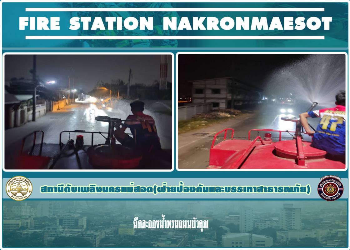 ดับเพลิงนครแม่สอด ออกฉีดล้างถนน เพื่อลดฝุ่น pm2.5 ถนนบัวคูณ