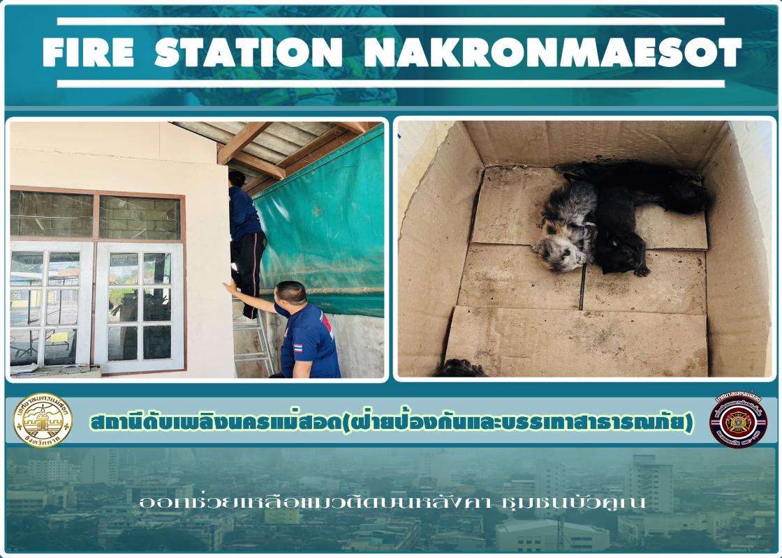 ดับเพลิงนครแม่สอด ออกช่วยเหลือแมวติดบนหลังคา ชุมชนบัวคูณ