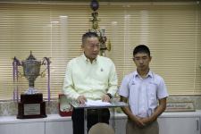 ดร.เทอดเกียรติ ชินสรนันท์ นายกเทศมนตรีนครแม่สอด ให้โอวาทและให้กำลังใจเด็กชายพัชรพล บริบาลการกิจ นักเรียนชั้นมัธยมศึกษาปีที่ 2 โรงเรียนเทศบาลวัดมณีไพรสณฑ์ และคณะครูโรงเรียนเทศบาลวัดมณีไพรสณฑ์