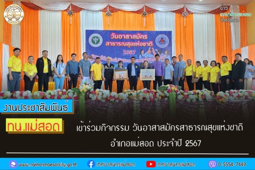 ว่าที่ร้อยตรี ประเสริฐ ปวงละคร นายกเทศมนตรีนครแม่สอด มอบหมายให้ นายกรกฤตย์ กรัณยพัฒนพงศ์ รองนายกเทศมนตรี นายเฉลิมเกียรติ ปัญญาสว่าง ผู้อำนวยการกองสาธารณสุขและสิ่งแวดล้อม และเจ้าหน้าที่คลินิกชุมชนอบอุ่น กองสาธารณสุขและสิ่งแวดล้อมเข้าร่วมกิจกรรม วันอาสาสมัครสาธารณสุขแห่งชาติ อำเภอแม่สอด ประจำปี 2567