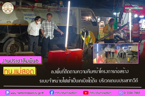 ว่าที่ร้อยตรี ประเสริฐ ปวงละคร นายกเทศมนตรีนครแม่สอด พร้อมด้วย คณะผู้บริหาร สมาชิกสภาเทศบาล และเจ้าหน้าที่ที่เกี่ยวข้อง ลงพื้นที่ติดตามความคืบหน้าโครงการก่อสร้างระบบจำหน่ายไฟฟ้าเป็นเคเบิลใต้ดิน บริเวณหน้าตลาดโต้รุ่ง ถนนประสาทวิถี ขอบเขตการทำงาน