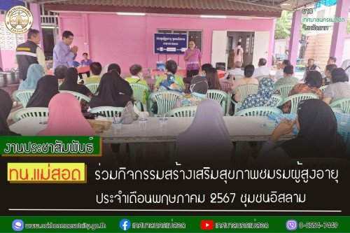ว่าที่ร้อยตรี ประเสริฐ ปวงละคร นายกเทศมนตรีนครแม่สอด มอบหมายให้ นายไกรสร กิจการ และ นายกรรณ กัณฑ์นิล รองนายกเทศมนตรีนครแม่สอด พร้อมด้วย สมาชิกสภาเทศบาลนครแม่สอด เจ้าหน้าที่คลินิกชุมชนอบอุ่น และเจ้าหน้าที่เทศบาลนครแม่สอด เข้าร่วมการประชุมกลุ่มผู้สูงอายุชุมชนอิสลาม ประจำเดือนพฤษภาคม โดยมีกิจกรรมตรวจสุขภาพเบื้องต้น พบปะพูดคุย เพื่อเปิดโอกาสให้ผู้สูงอายุในชุมชนได้แลกเปลี่ยนความคิดเห็นและทำกิจกรรมร่วมกัน