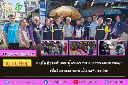 ว่าที่ร้อยตรี ประเสริฐ ปวงละคร นายกเทศมนตรีนครแม่สอด พร้อมด้วย คณะผู้บริหาร สมาชิกสภาเทศบาล ผู้อำนวยการกองสาธารณสุขและสิ่งแวดล้อม และเจ้าหน้าที่ที่เกี่ยวข้อง ลงพื้นที่ร่วมกับคณะผู้ตรวจราชการกระทรวงสาธารณสุข เพื่อติดตามสถานการณ์โรคอหิวาตกโรค