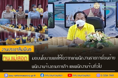 ร่วมให้การต้อนรับพร้อมมอบนโยบายและให้โอวาทแก่พนักงานราชการโอนย้าย พนักงานจ้างตามภารกิจและพนักงานจ้างทั่วไป ที่มาดำรงตำแหน่งประจำเทศบาลนครแม่สอด จำนวน 10 ท่าน ได้แก่