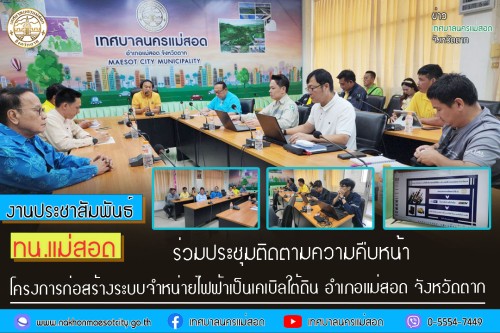 ว่าที่ร้อยตรี ประเสริฐ ปวงละคร นายกเทศมนตรีนครแม่สอด เป็นประธานการประชุมฯ พร้อมด้วย คณะผู้บริหาร สมาชิกสภาเทศบาล พนักงานเทศบาลนครแม่สอด และหน่วยงานที่เกี่ยวข้อง เข้าร่วมประชุมโครงการก่อสร้างระบบจำหน่ายไฟฟ้าเป็นเคเบิลใต้ดิน บริเวณถนนประสาทวิถี อำเภอแม่สอด จังหวัดตาก เพื่อประชุมติดตามความคืบหน้า และหารือถึงปัญหาอุปสรรค เพื่อร่วมกันแก้ไขปัญหา บรรเทาความเดือดร้อนของประชาชน