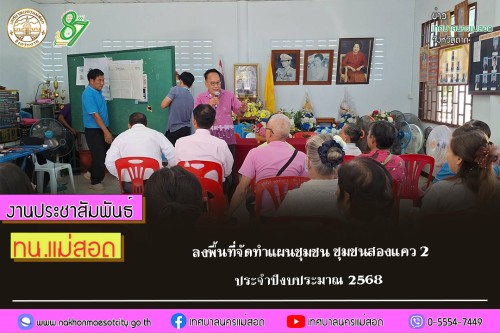 ว่าที่ร้อยตรี ประเสริฐ ปวงละคร นายกเทศมนตรีนครแม่สอด มอบหมายให้ นายไกรสร กิจการ รองนายกเทศมนตรี พร้อมด้วย สมาชิกสภาเทศบาลนครแม่สอด เจ้าหน้าที่กองยุทธศาสตร์และงบประมาณ และเจ้าหน้าที่กองสวัสดิการสังคม ลงพื้นที่จัดทำแผนชุมชน ชุมชนสองแคว 2 ประจำปีงบประมาณ 2568