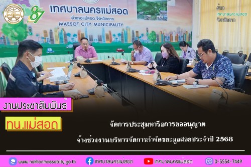 ว่าที่ร้อยตรี ประเสริฐ ปวงละคร นายกเทศมนตรีนครแม่สอด มอบหมายให้ นายไกรสร กิจการ รองนายกเทศมนตรี เป็นประธานการประชุมฯ พร้อมด้วย สมาชิกสภาเทศบาล นายประสาน มั่นมาก รองปลัดเทศบาลนครแม่สอด รักษาราชการแทน ผู้อำนวยการกองช่างสุขาภิบาล และผู้อำนวยการกองคลัง และเจ้าหน้าที่ที่เกี่ยวข้อง เข้าร่วมการประชุมหารือการขออนุญาตจ้างช่วงงานบริหารจัดการกำจัดขยะมูลฝอยประจำปี 2568